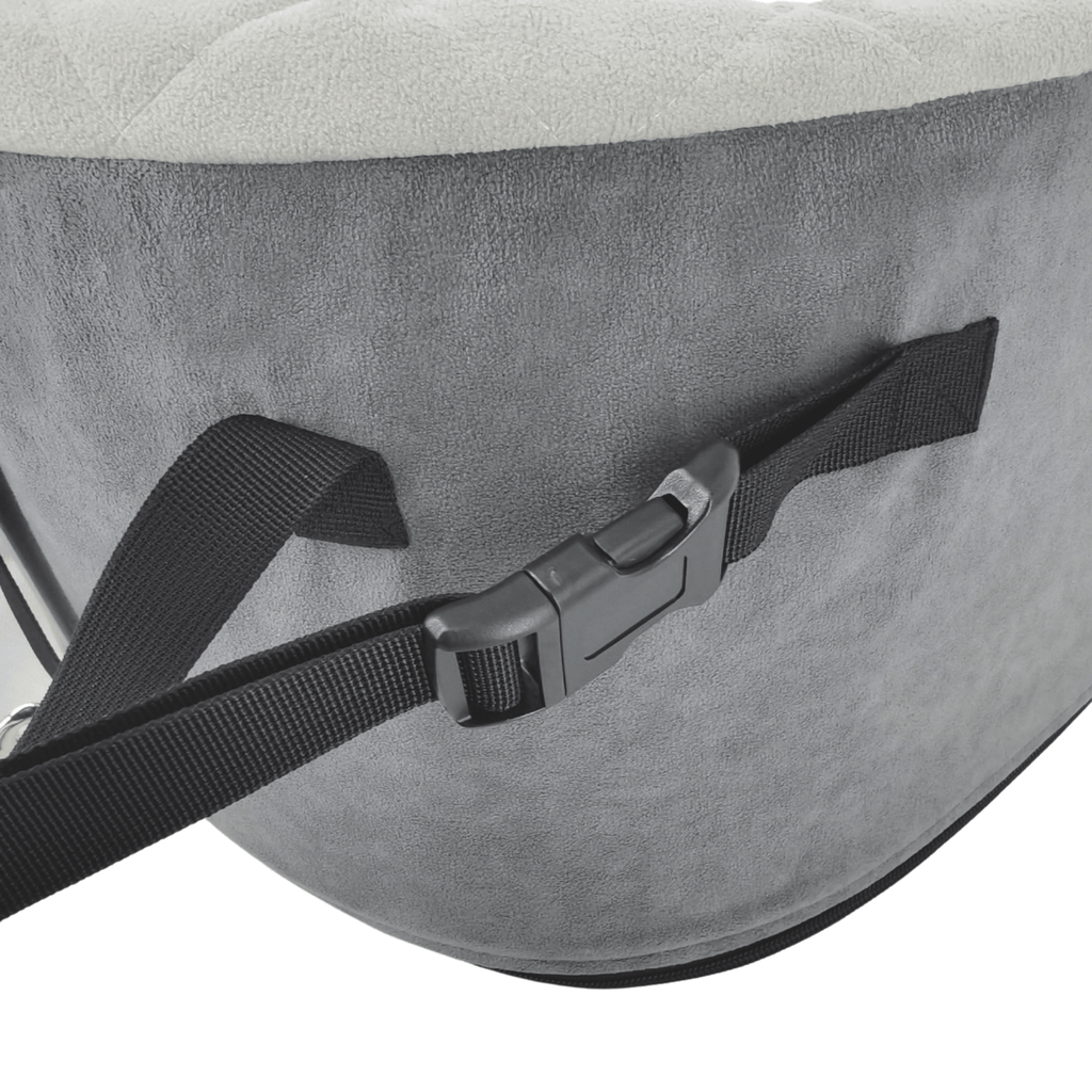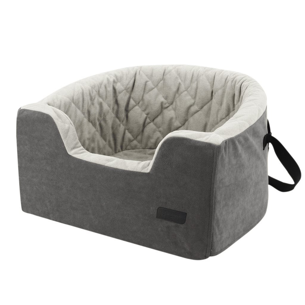 Grey in colour and made from polyester, this canine booster seat is a staple for any small dog owner. Padded with thick foam, it comes with a removable cover and non-slip bottom. It also boasts two sets of tethers. The first hooks into your pup�s collar to keep them from jumping out while the vehicle�s in motion.