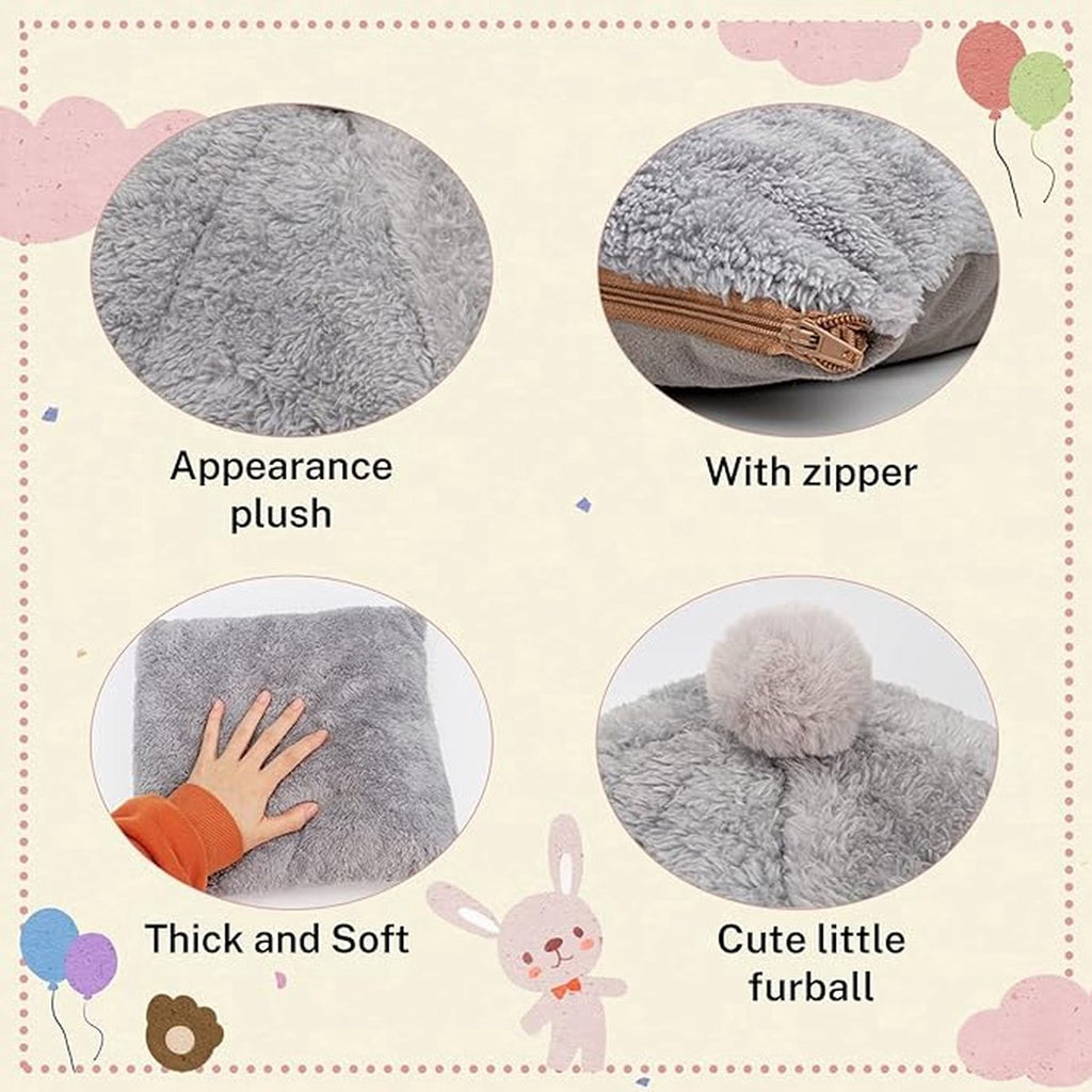 【Large Rabbit House】: 34*34*36cm. The gray rabbit hideout is more suitable for small animals such as rabbits, bunnies, adult guinea pigs,lop, mini rex, New Zealand rabbits, adult guinea pigs, ferrets, chinchillas and the like size animals. It is a choice for a long time using because the large rabbit cave leaves space for your rabbit, so it is a choice for a long time using. Suitable for pets under 10 kilos. 【Wide Entrance】: Triangular cave bed with non-slip bottom is sturdy enough and not easy to collapse. It is very large, so your baby has space to stretch out when taking a nap. The height of the tent makes it feel safe, so if your pet loves some time for itself, this kawaii tent house is a good choice for your pets to have their own privacy area. The guinea pig tent home is also soft and fluffy, so it's perfect for jumping in and out. 【Warm & Cozy】: Cute rabbit hutch with a removable inner cushion so you can easily machine wash it to keep pet clean and sanitary. Plush exterior, soft PP cotton filling and non-slip bottom to make the bed safer and more comfortable. The super soft inner cushion makes your pet curl up quickly. The gray plush surface does not get dirty easily it can be hand or machine washed. 【Relax & Rest】: The rabbit bed hideout provides your lovely pets with a private, warm and comfortable hideaway, so your pet can hide and curl up in this cozy triangular tent. The rabbit tent hideout allows your pets to enjoy certain activities and provides a comfortable and safe resting space. Rabbits that take a nap in the rabbit igloo are friendlier, calmer and less anxious, leading to a relaxing environment at home.