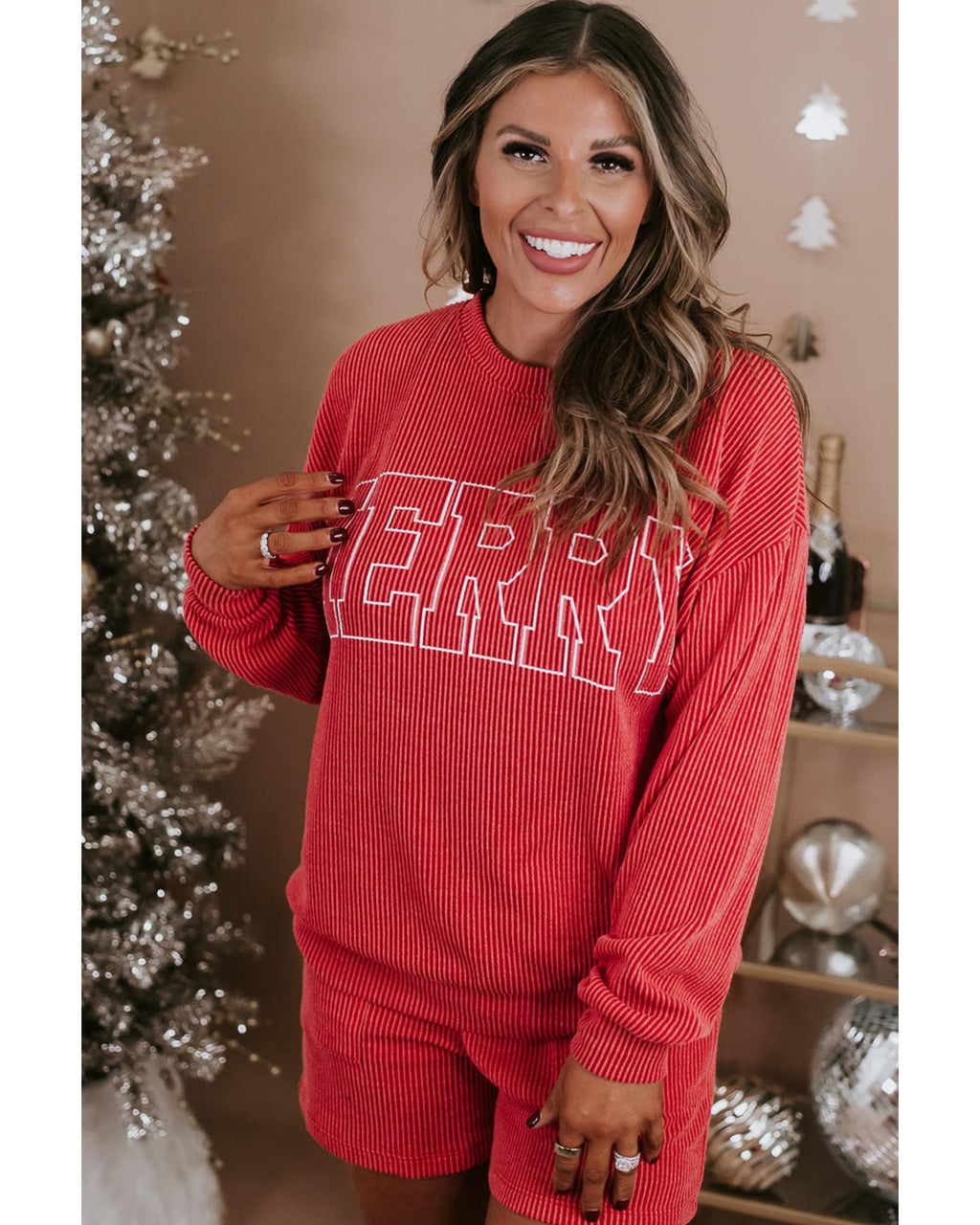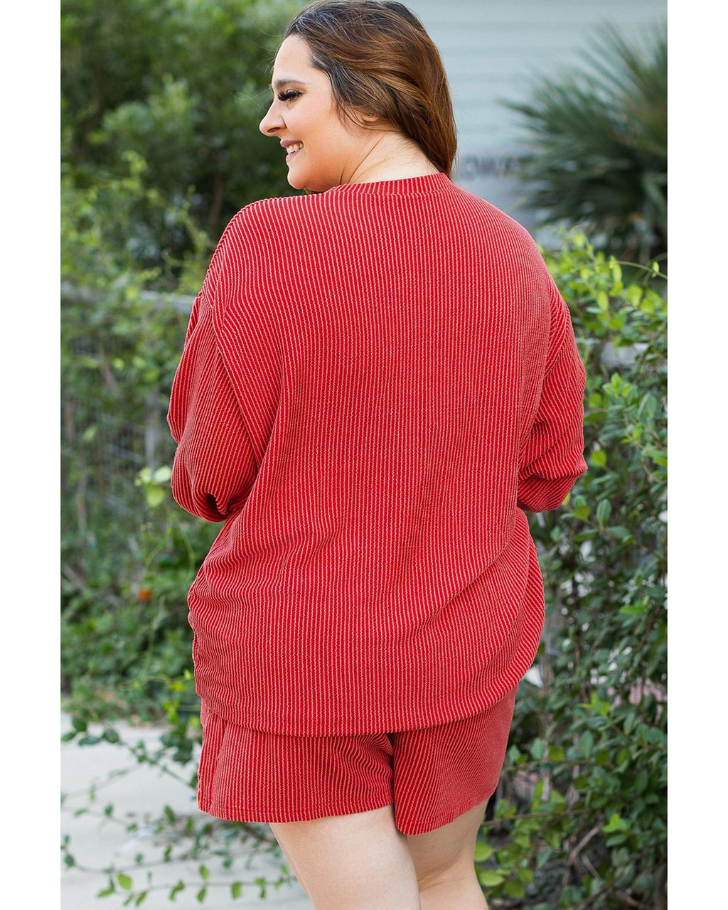 Racing Red MERRY Ribbed Knit Long Sleeve Lace-up Waist Plus Size Set - 1X