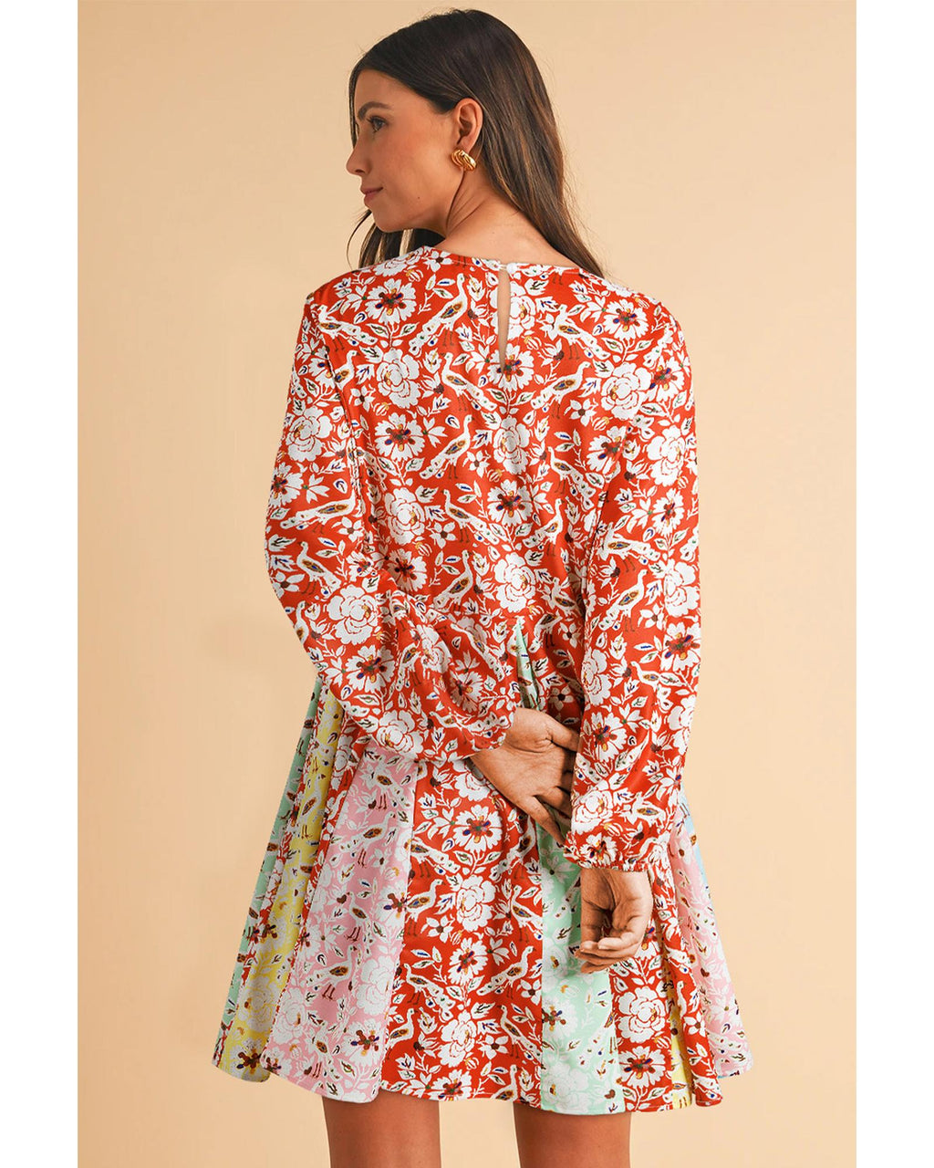 Red Colorful Floral Patchwork Long Sleeve Pleated Mini Dress - M