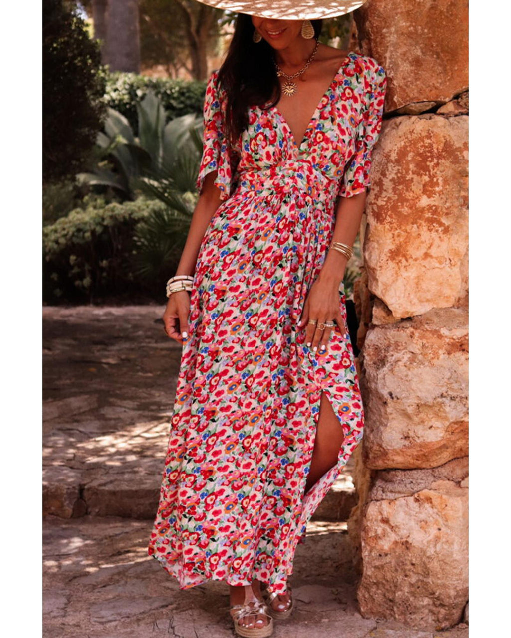 Red Floral Half Sleeve Deep V Neck Cutout Back Split Maxi Dress - S