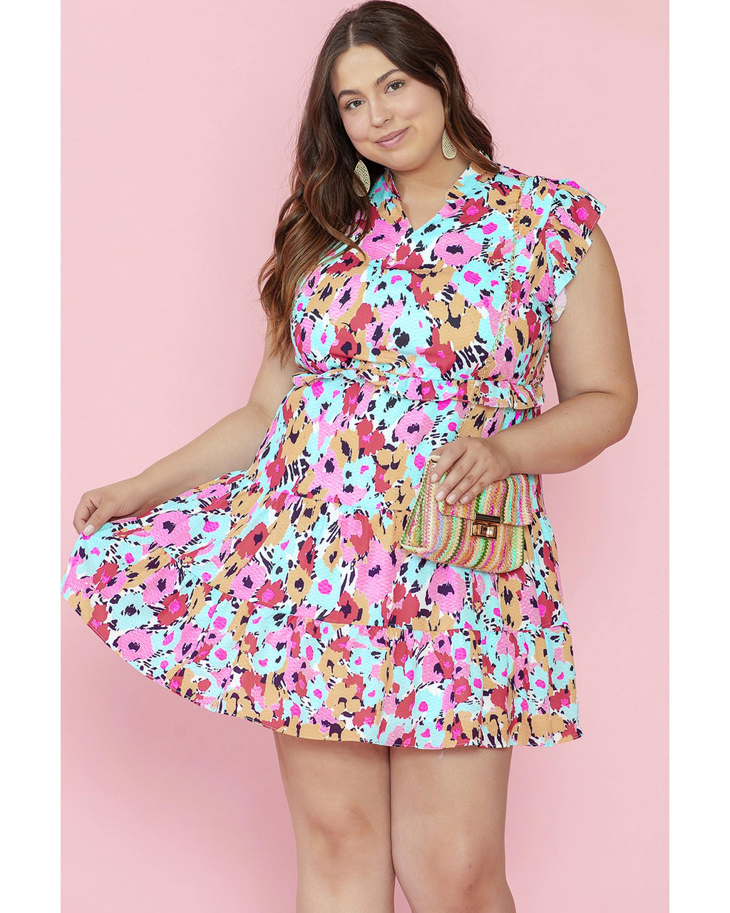 Red Floral Ruffled Cap Sleeve Plus Size Mini Dress - 1X