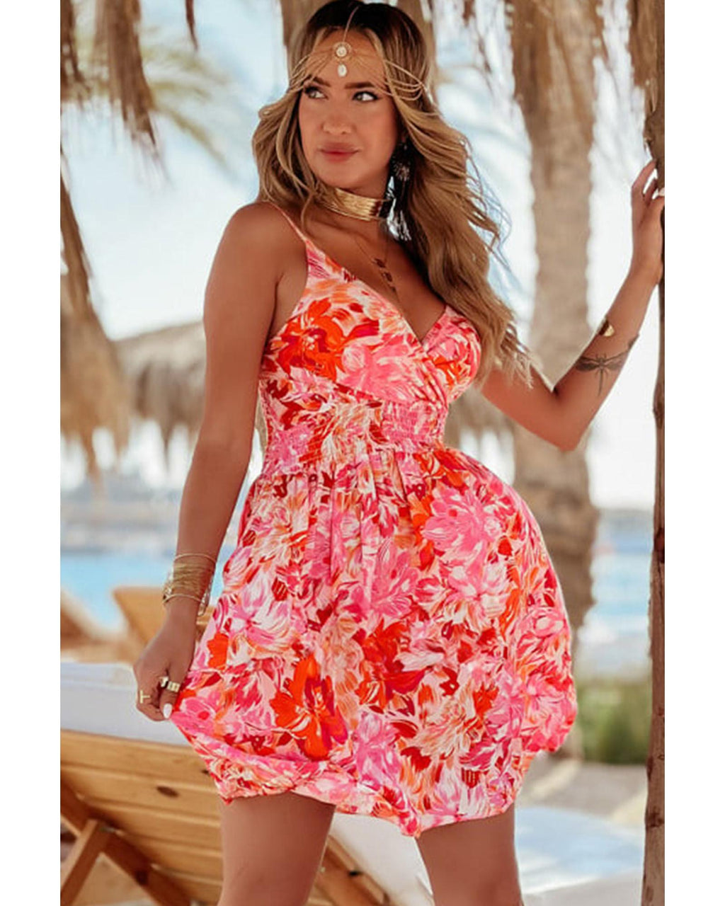 Red Floral Spaghetti Strap Surplice Neck Shirred Waist Mini Dress - M