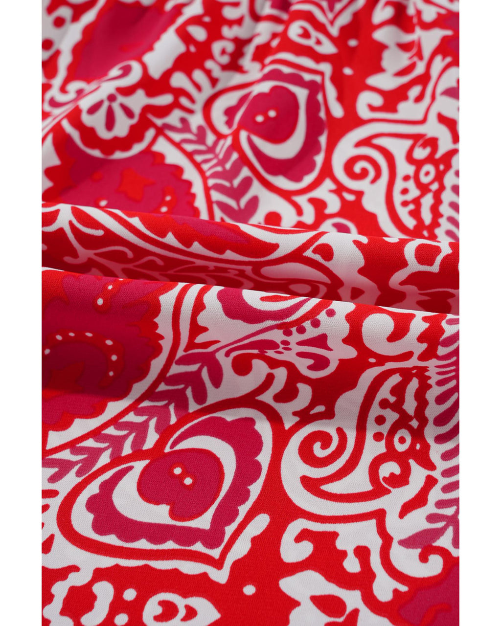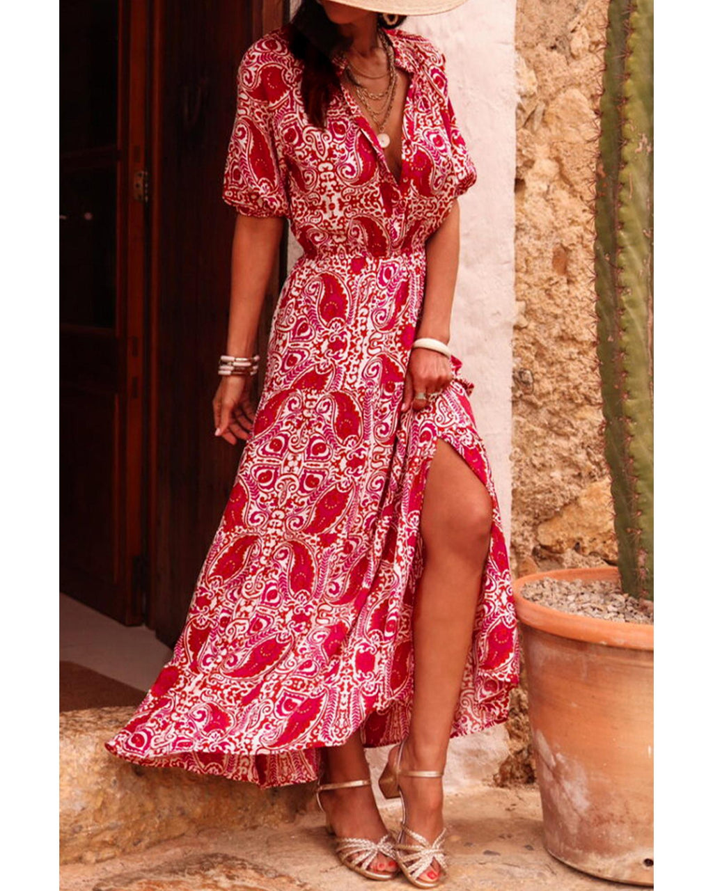 • Red Paisley Print Side Slit Puff Sleeve High Waist Maxi Dress