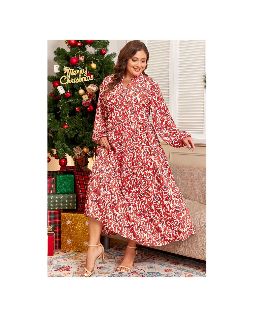 Red Plus Size Abstract Print Notch V Neck High Waist Maxi Dress - 4X