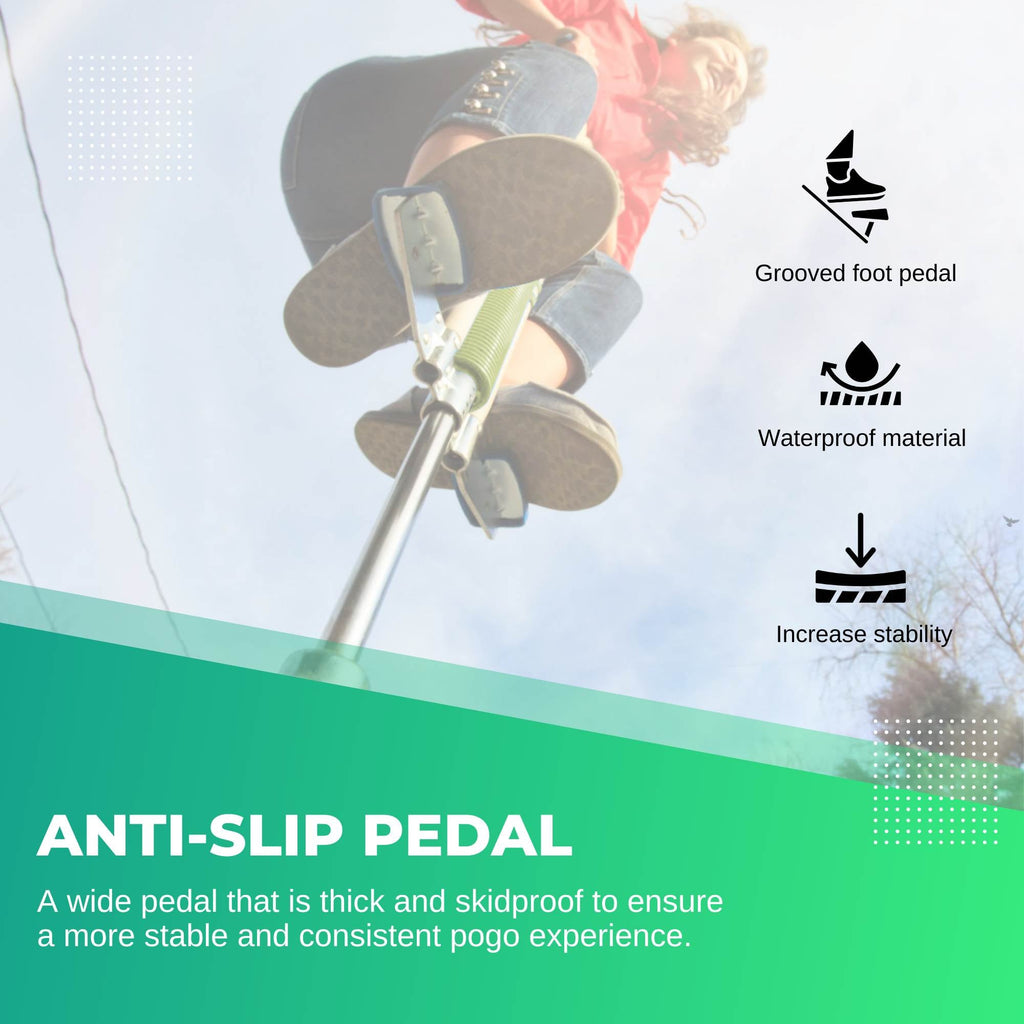 The shafts of these jackhammer pogo jumpers are made of solid durable iron alloy. Handlebar grip is made of anti skid ABS material protection cover. The pedal also has an excellent anti-skid effect; it can help you or your child not to slip. The spring is made of high quality solid and durable manganese steel.