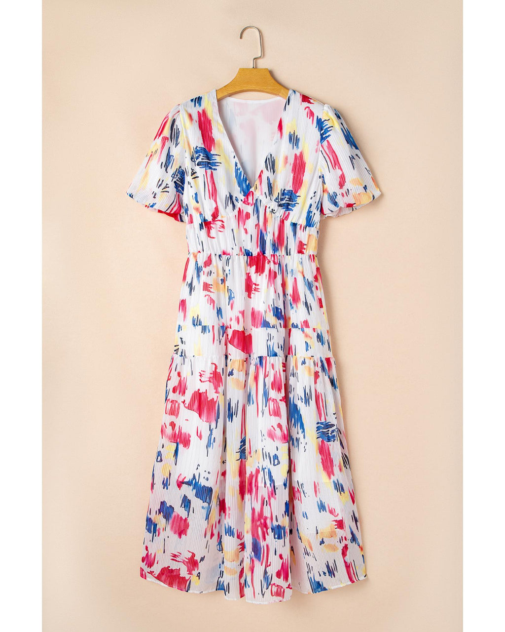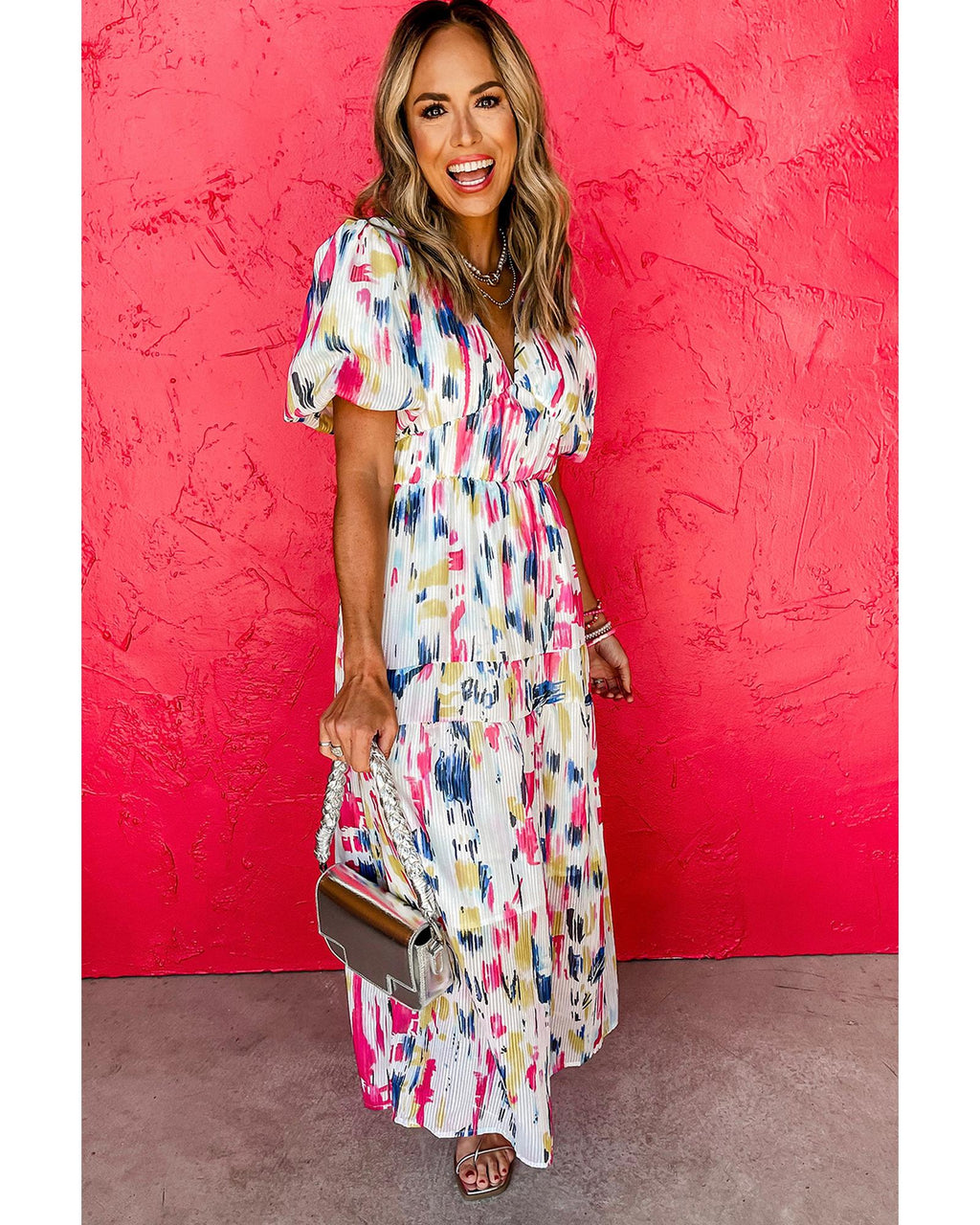 Rose Abstract Print Short Puff Sleeve Tiered Maxi Dress - S