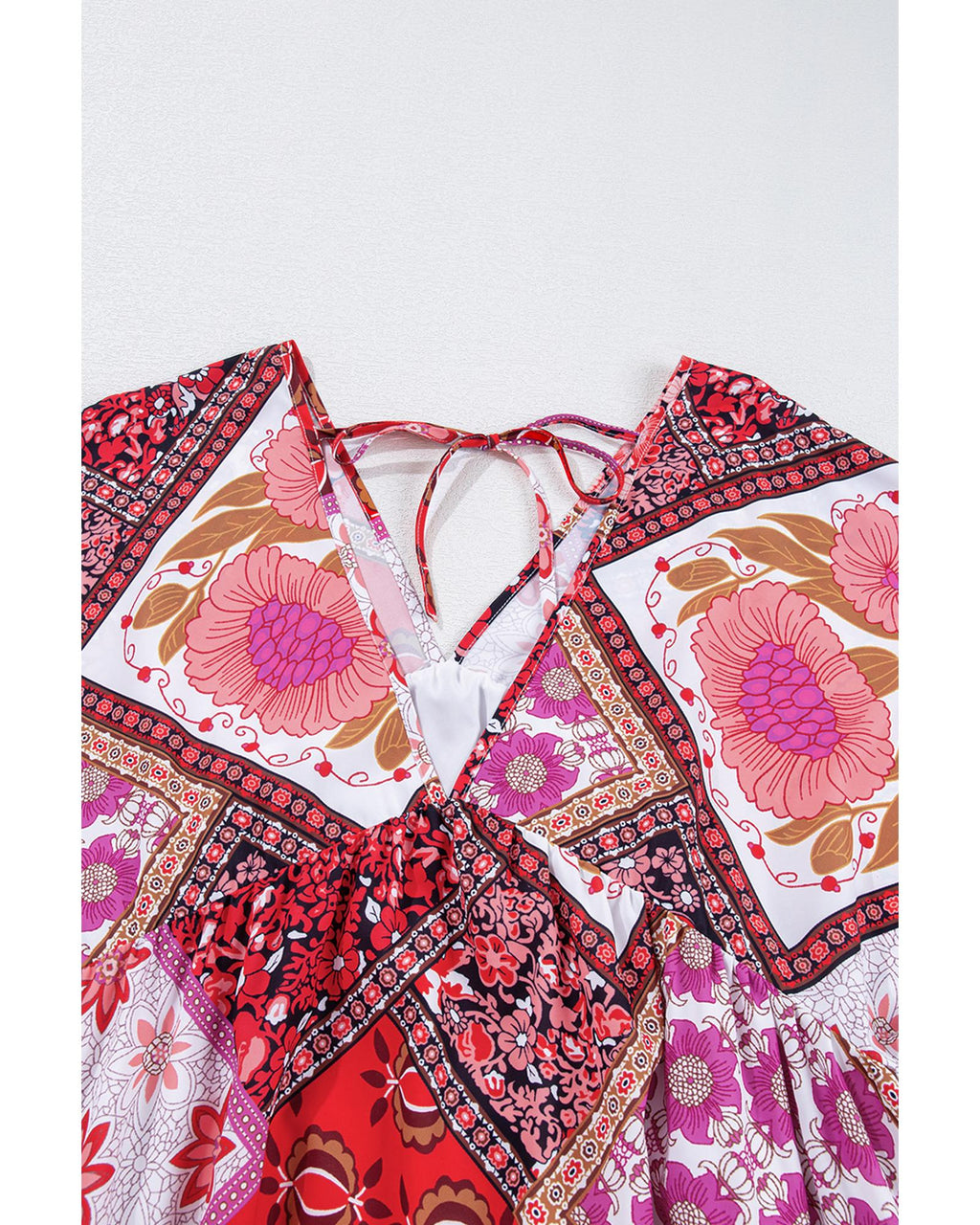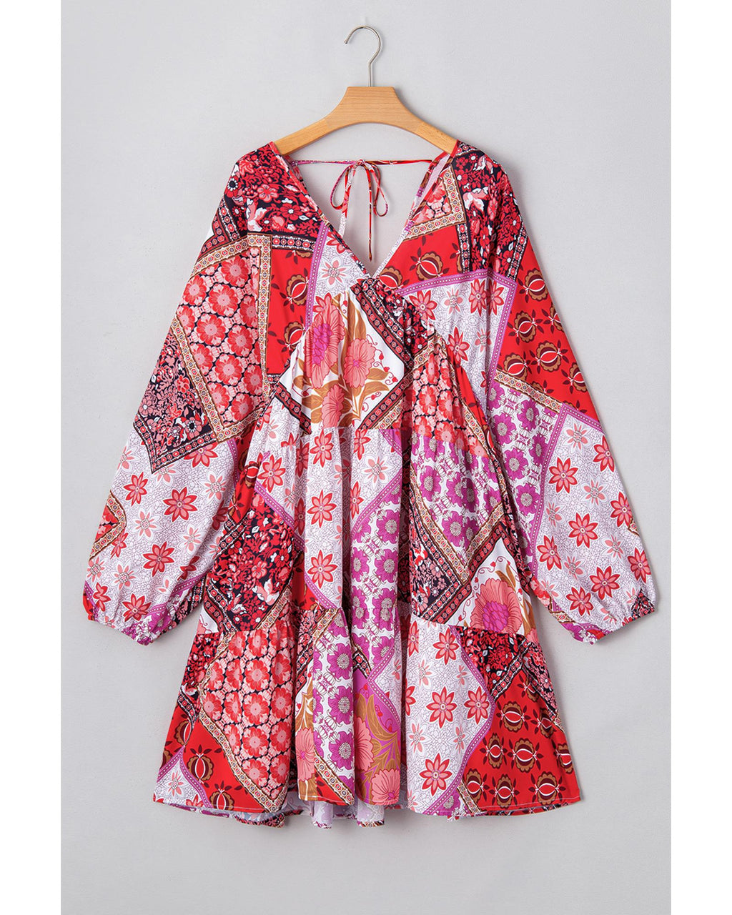 Rose Mixed Floral Long Sleeve V Neck Lace-up Hollowed Back Plus Size Dress - 2X