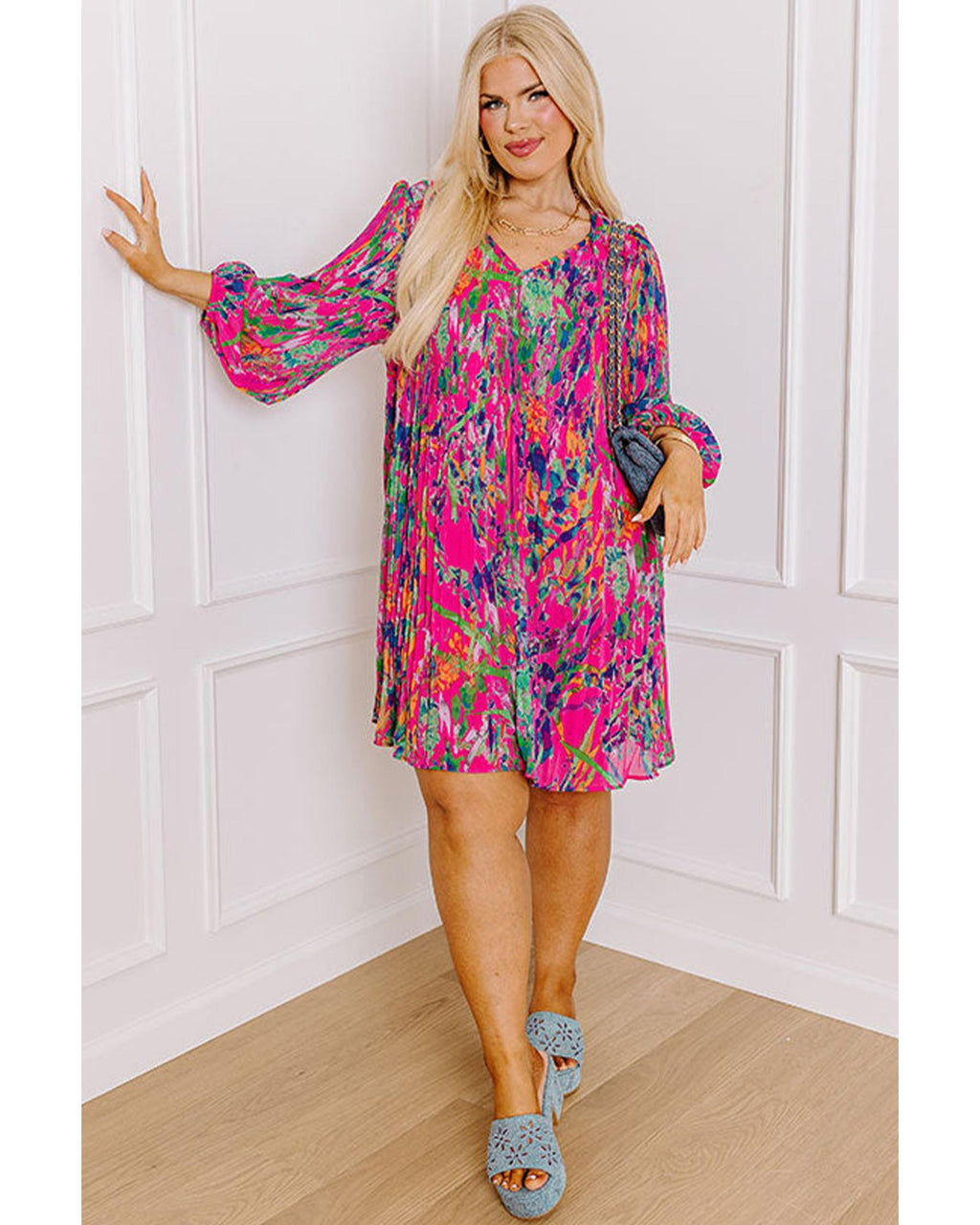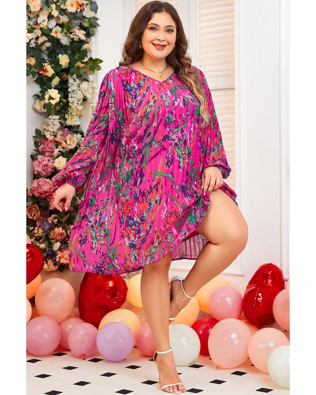 Rose Plus Size Abstract Floral Print Pleated Loose Dress - 3X