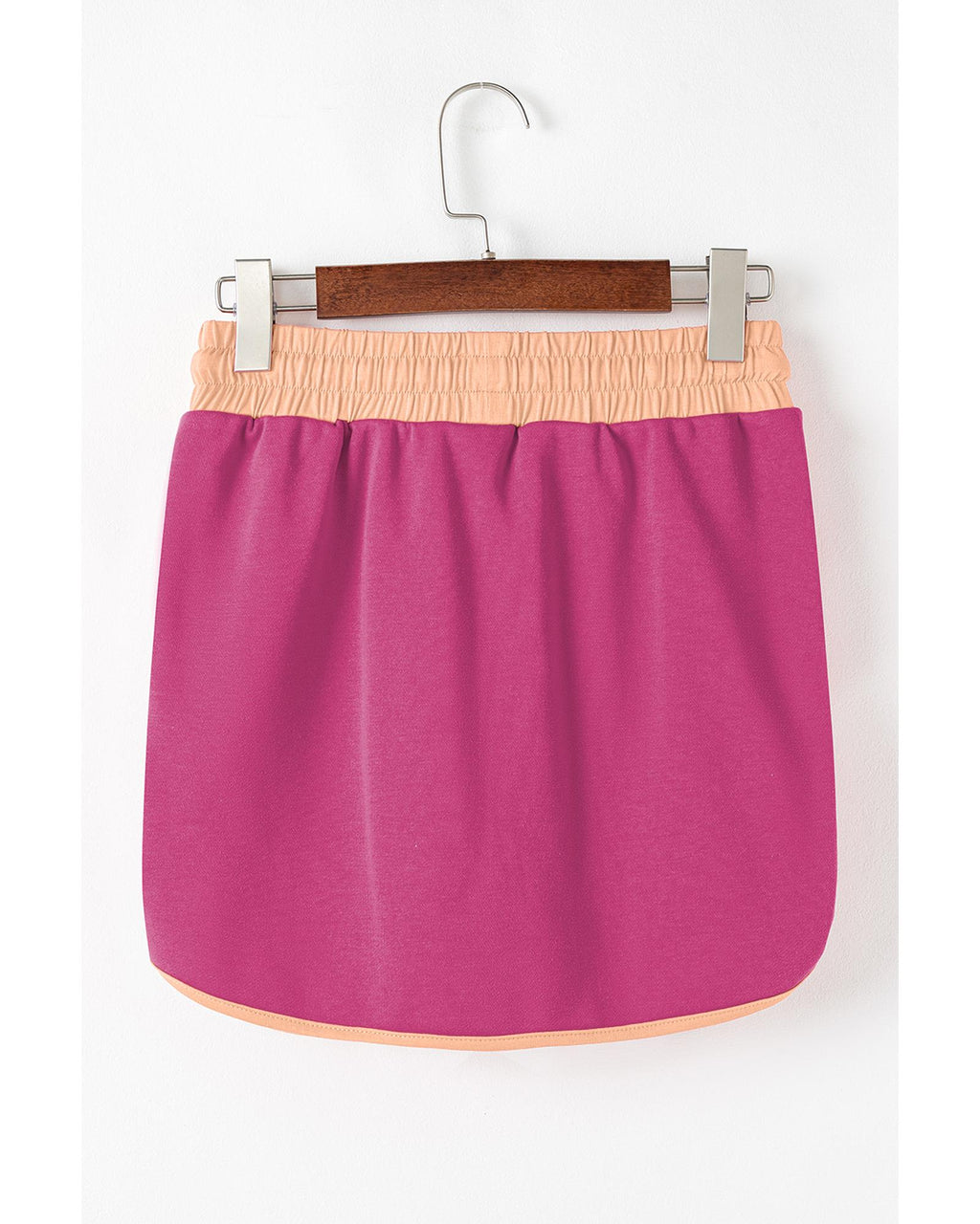 Rose Red Color Contrast Loose Pullover and Lace-up Waist Skort Set - S