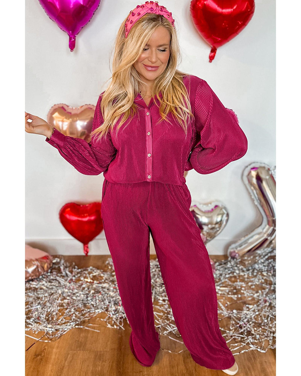 Rose Red Plus Size Ribbed Long Sleeve Shirt and Pants Pajama Set - 1X