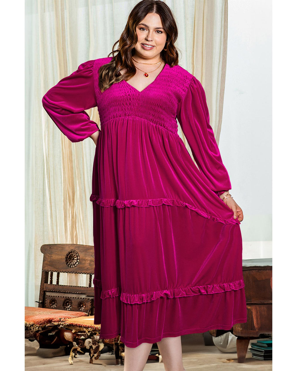 Rose Red Shirred V Neck Tiered Ruffled Velvet Plus Size Maxi Dress - 4X