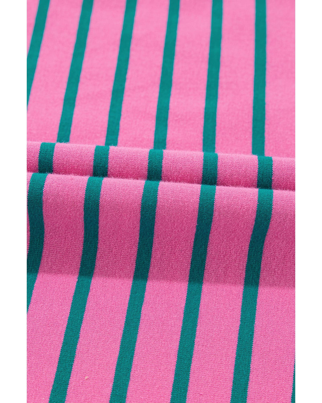 Rose Stripe Collared V Neck Puff Sleeve Shift T Shirt Dress with Pockets - 3X