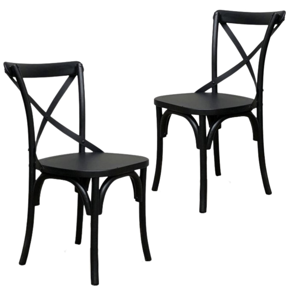 This gorgeous set of 2pc dining chairs adorns your dining area. Designed in the contemporary style, the chairs are in black, and they have strong legs. The chair frame and seat are made of Birchwood. A cross back in classy design gives them a cool look. Their legs are made of metal in Matt Black colour. The chairs look stunning in all decor settings, thanks to their inviting shape and colour. A one-year warranty is included with the fully assembled chairs.