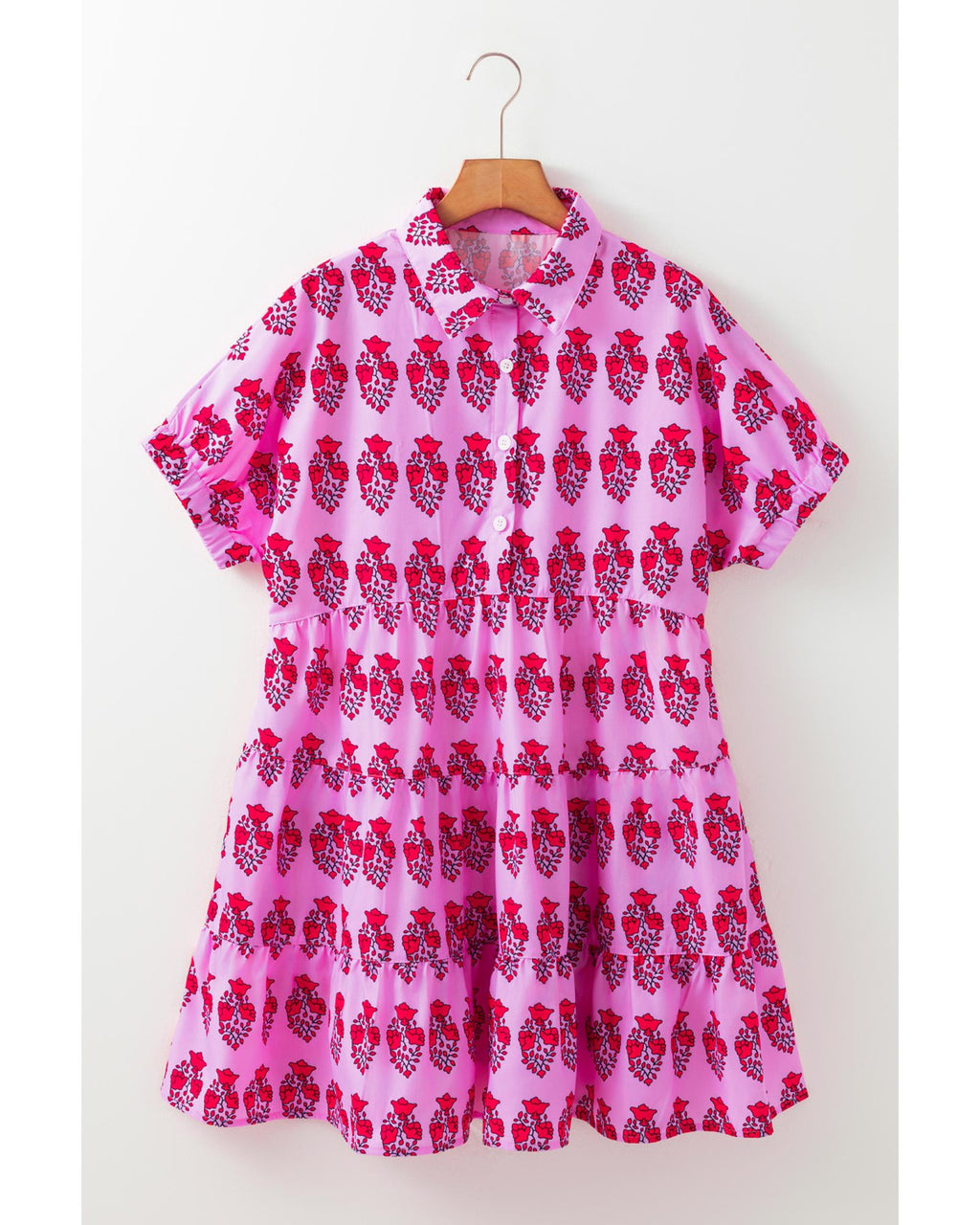 - Sachet Pink Floral Print Multi Buttons Collared Short Sleeve Flowy Dress