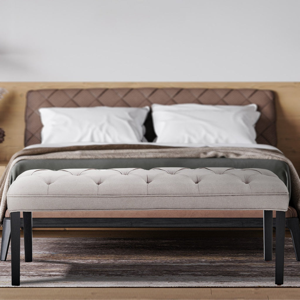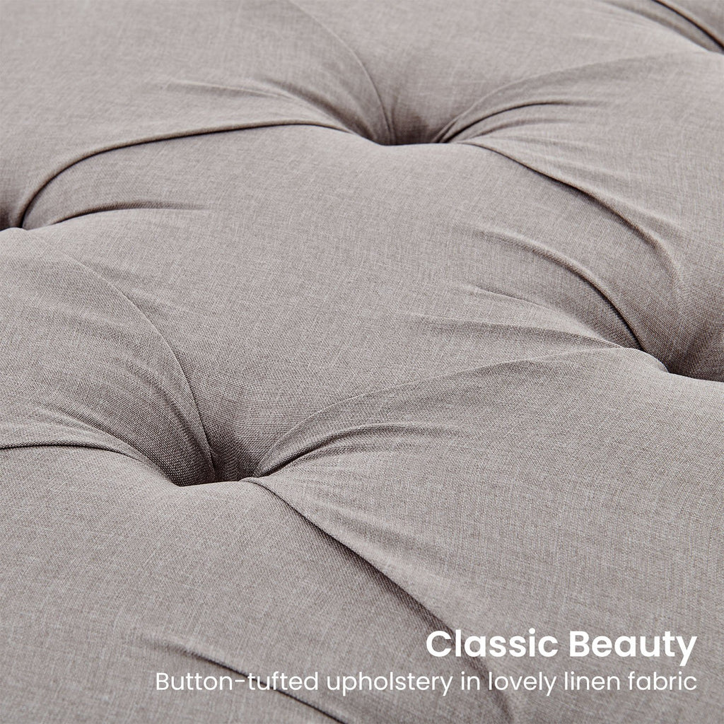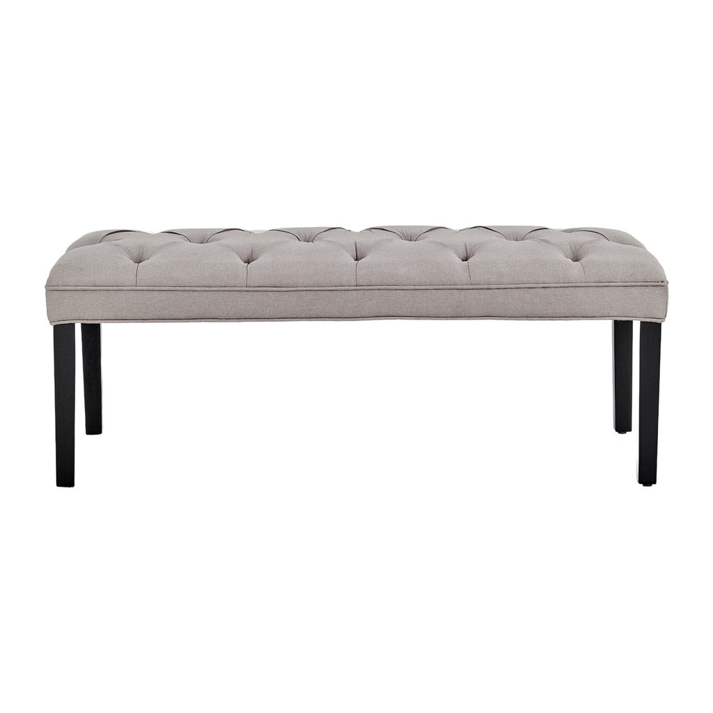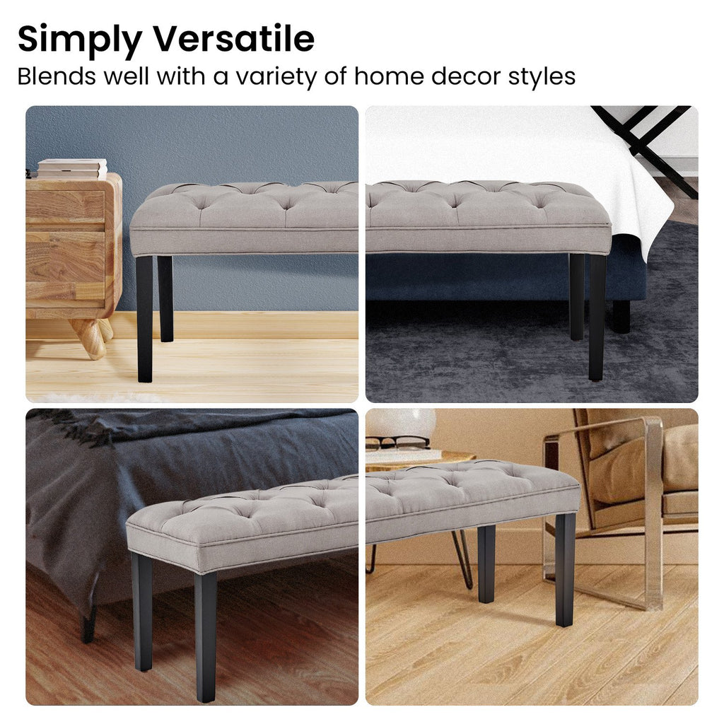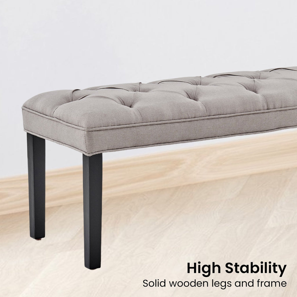 The button-tufted upholstery is made with breathable linen and sits on top of solid wooden legs for superior durability. This bench measures 123cm wide and offers generous seating for you and your guests. Choose from three fabulous shades to complement your existing home decor!
