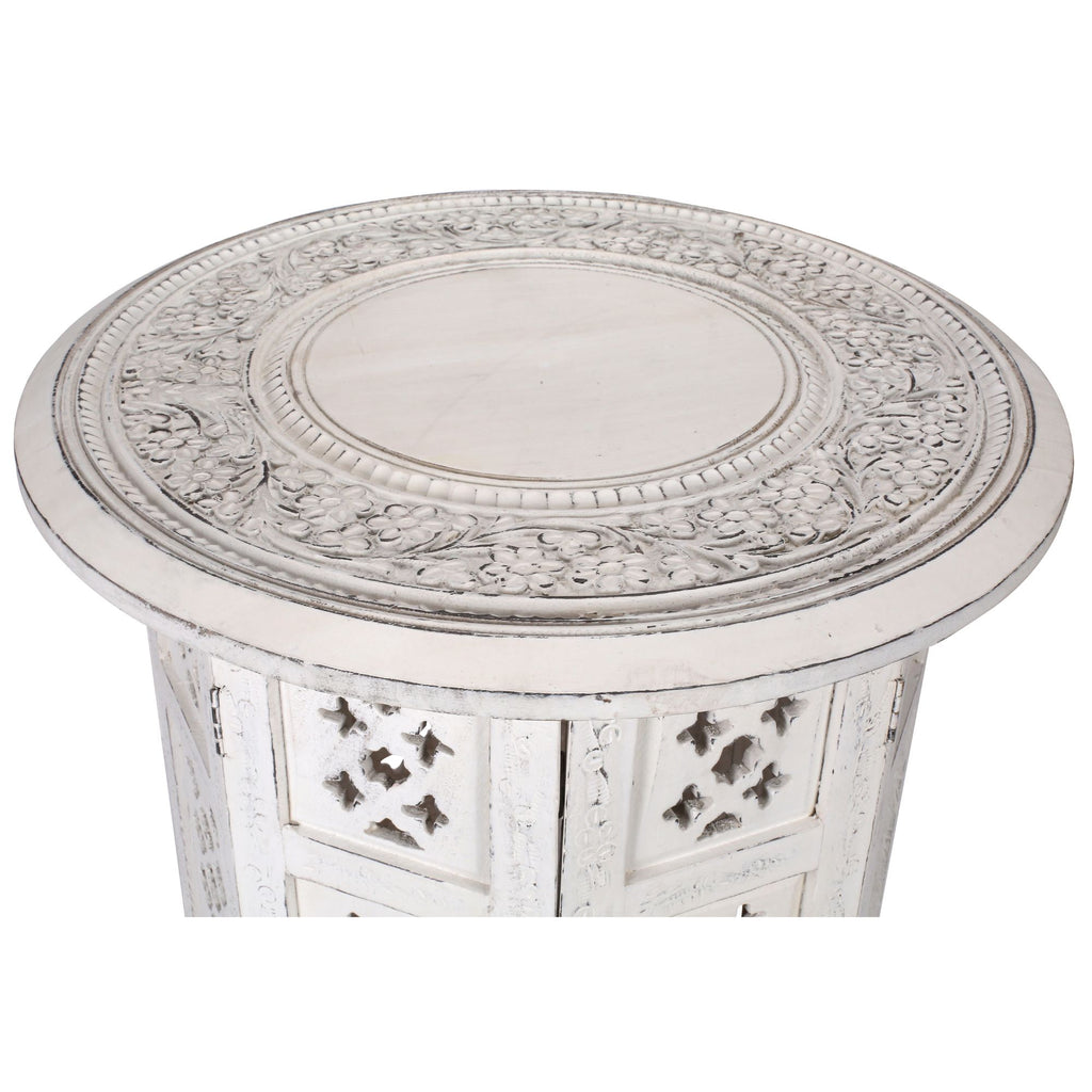This beautiful side table augments the appeal of a living room. With its distinct design, round tabletop, octagonal lower part, and white colour, the traditional style side table looks charming in your living area. The table is designed in an exotic pattern using sustainably harvested solid mango wood. The wood ensures the table's high water resistance, long durability, and beautiful appearance. It will become the perfect companion for any kind of lounge or sofa, while becoming a beautiful spot for lampshades, vases, photo frames, etc.The fully assembled side table comes with a one-year warranty.