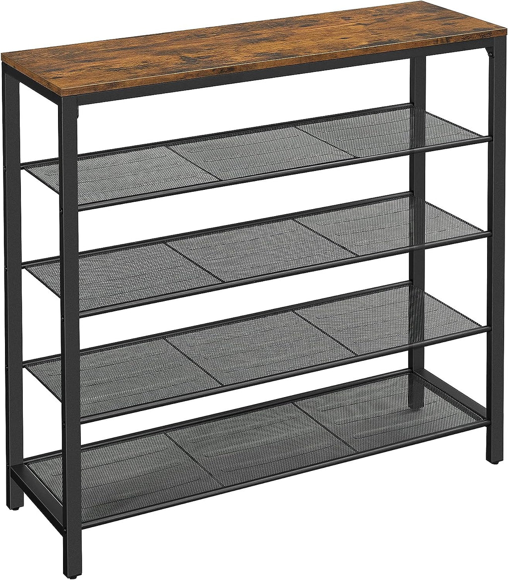 - This stylish storage shelf is designed to keep your home organized. With four open shelves featuring a dense iron mesh, you can store up to 10 kg of items on the top surface and up to 5 kg on each shoe shelf. The rustic brown finish adds a touch of charm to any room, perfect for displaying bags, keys, picture frames, and even a beautiful bouquet of roses.