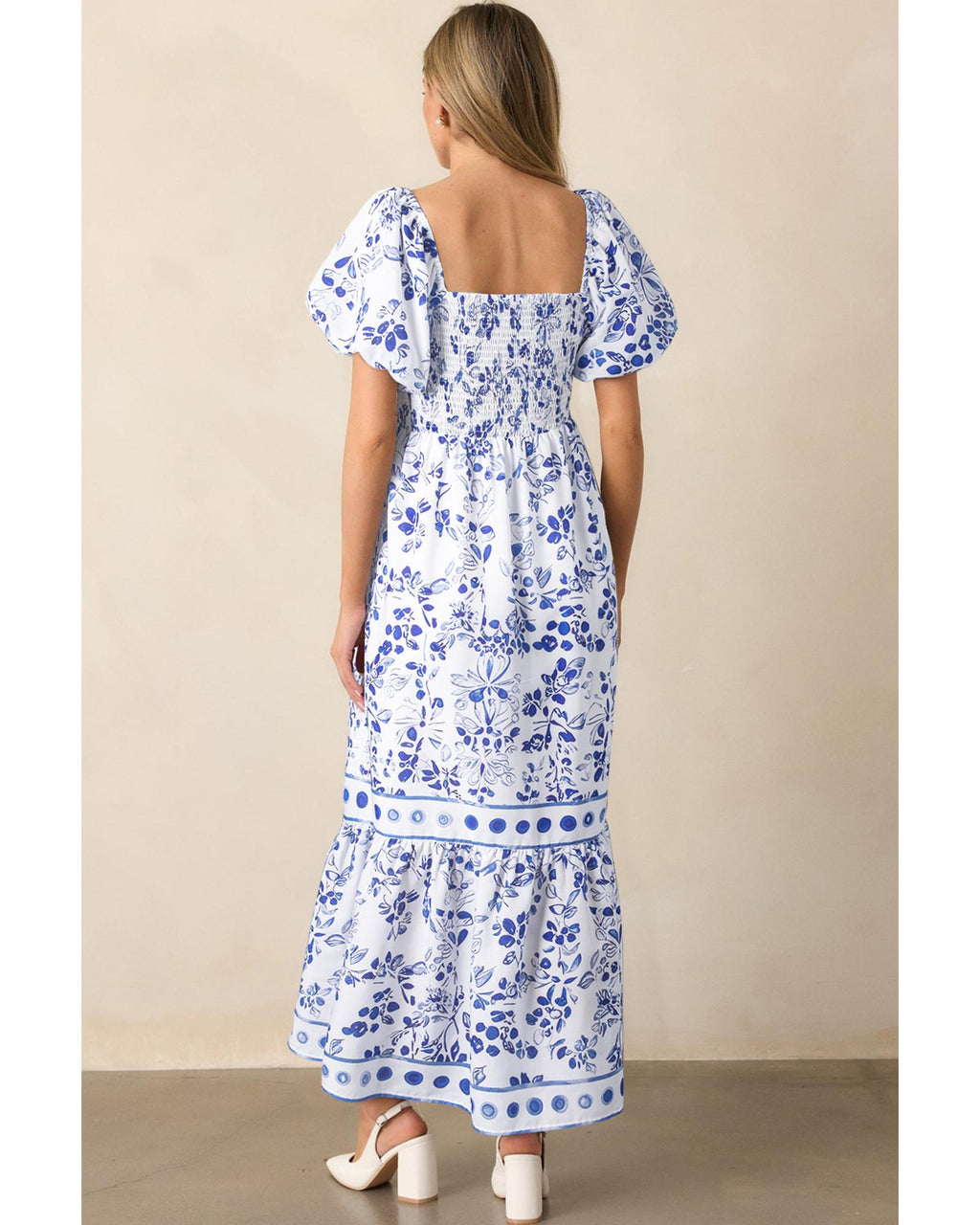 Sky Blue Floral Print Square Neck Bubble Sleeve High Waist Maxi Dress - XL