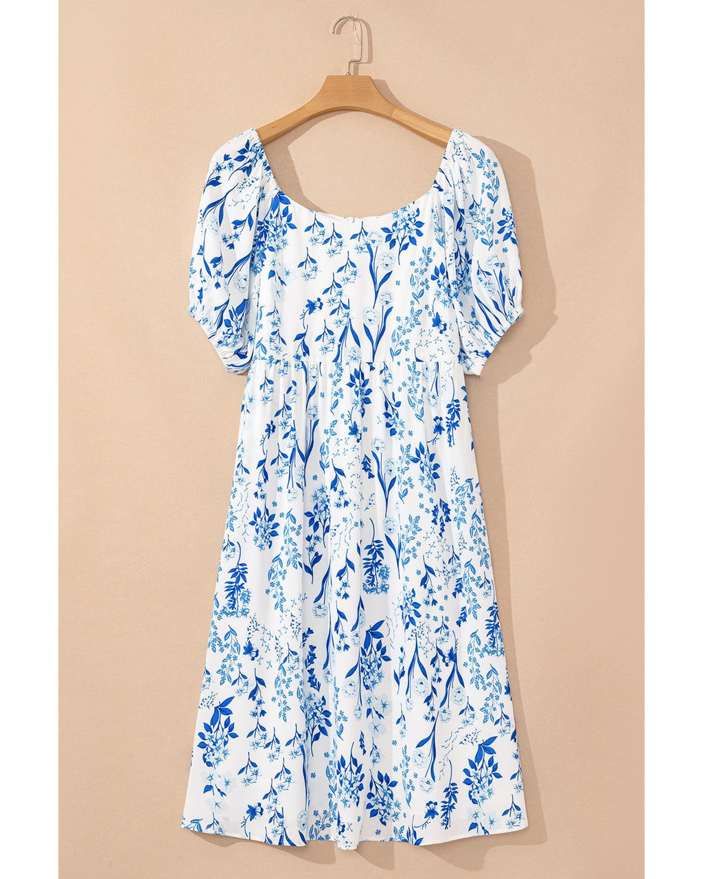 Sky Blue Floral Print Sweetheart Neck Plus Size Midi Dress - 1X