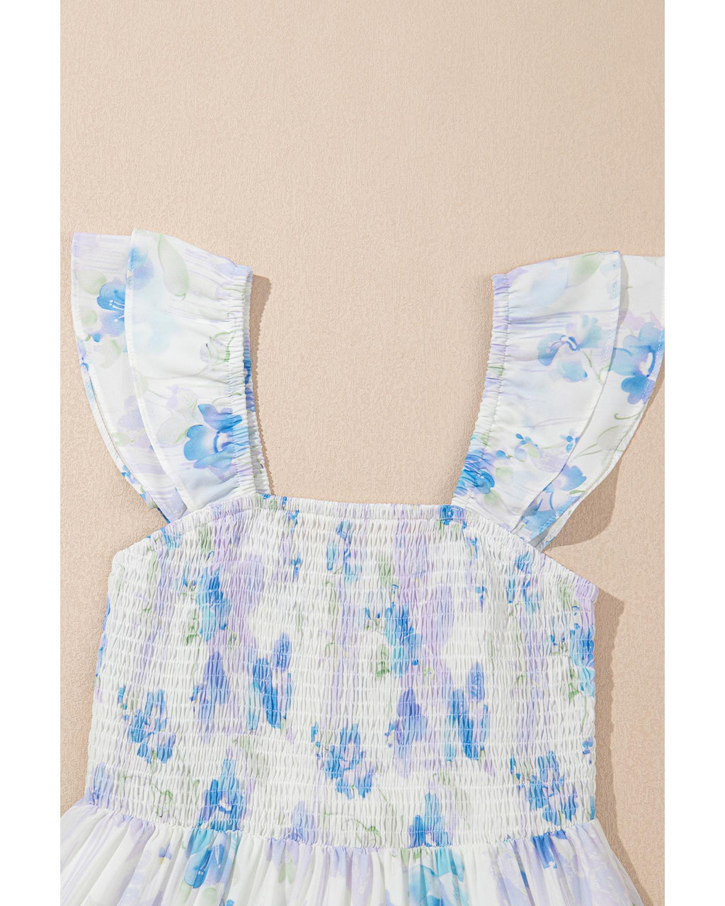 Sky Blue Floral Smocked High Waist Double Ruffle Sleeveless Long Dress - L