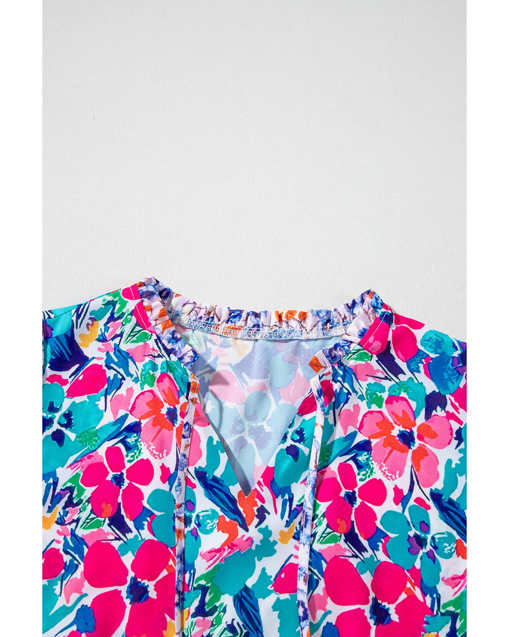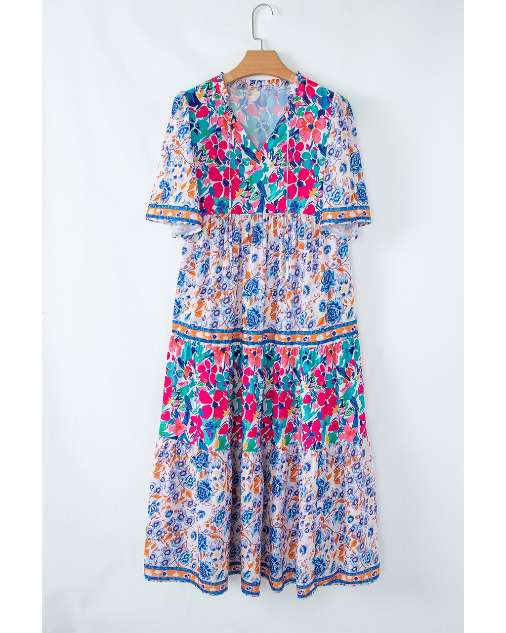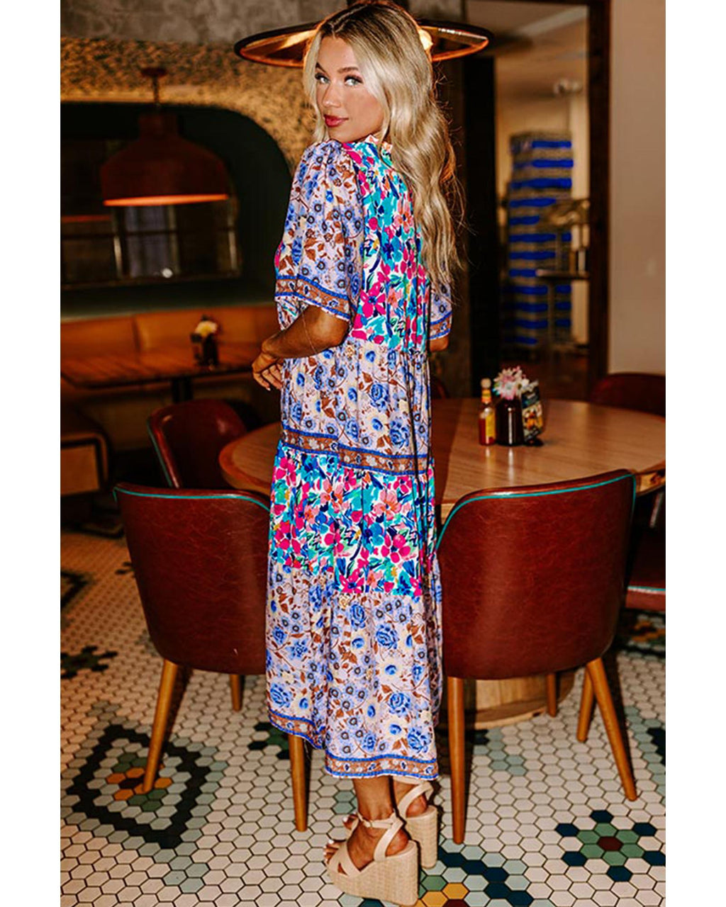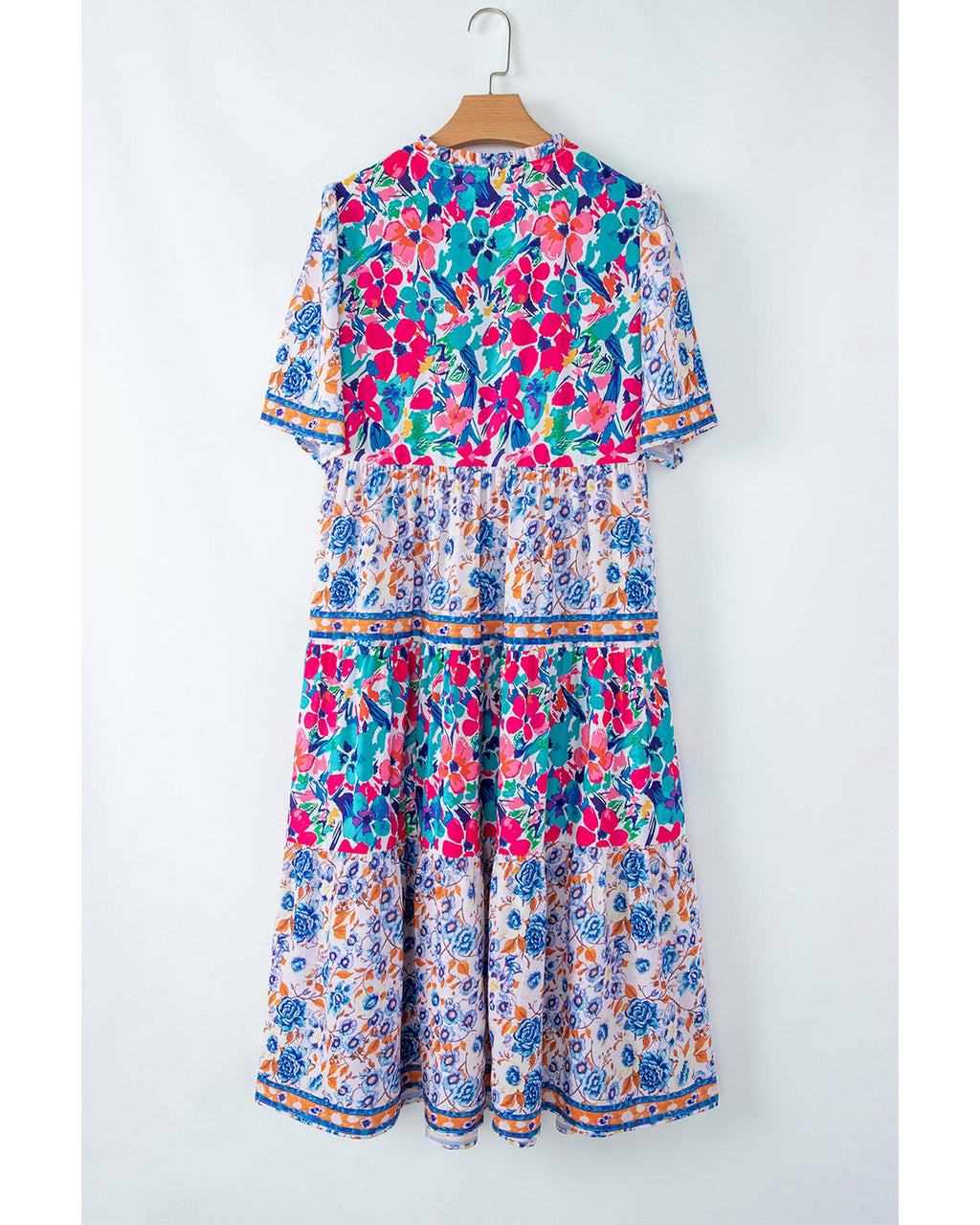 • Sky Blue Mixed Floral Print Tie Split Neck Short Sleeve Dress