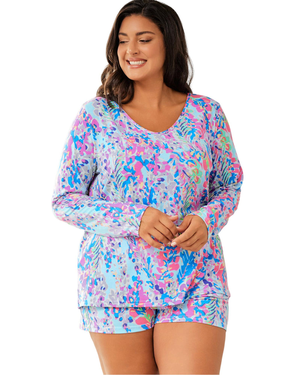 - Sky Blue Plus Size Floral Print Long Sleeve and Shorts Lounge Outfit