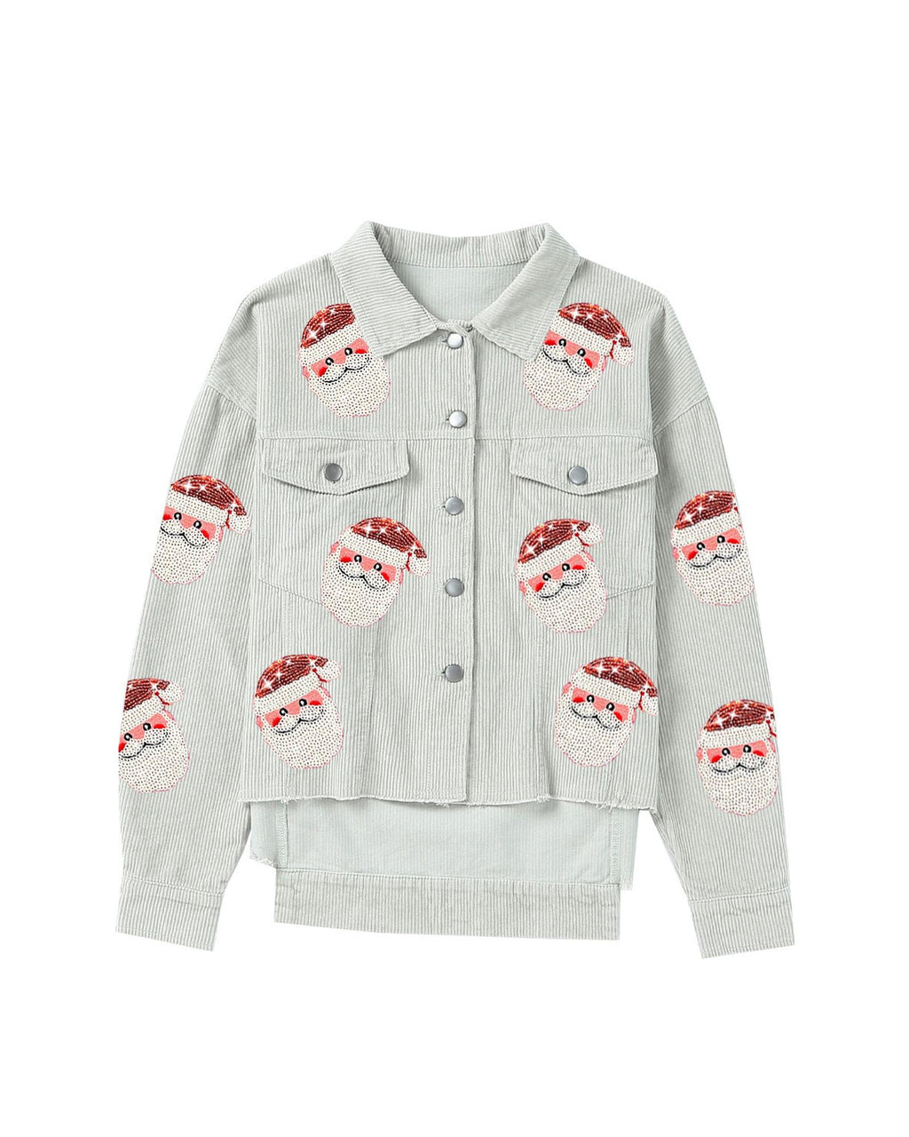 • Our styles are designed with a trendy fitted look in mind following an international size standard. For the best fit we suggest choosing one size up from your usual. Be sure to check our sizing chart to find your perfect match! Sky blue sequined Santa Claus flap pocket corduroy jacket Unique Santa Claus print on the flap pocket Made from high