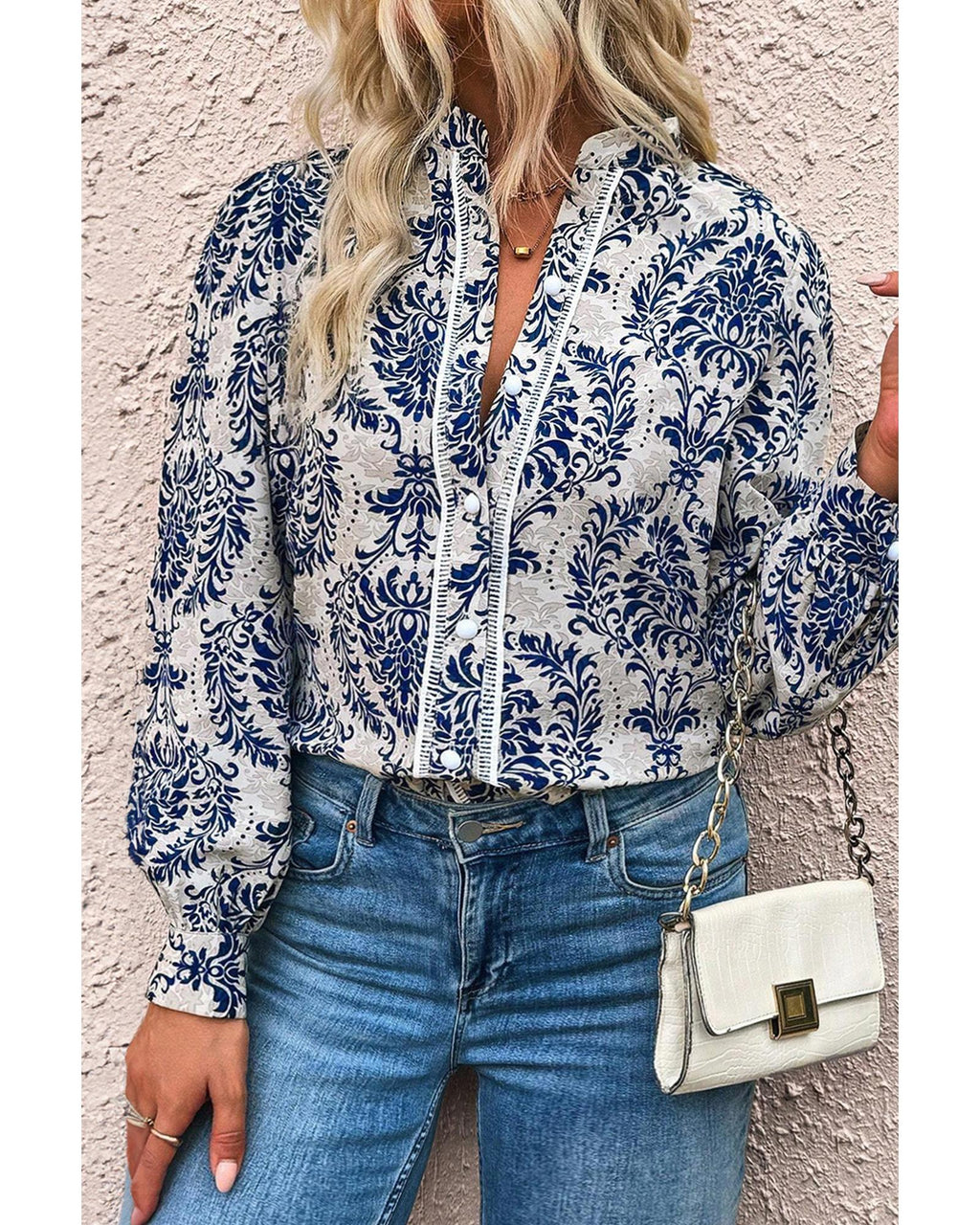 Sky Blue Tribal Pattern Print Notch Neck Buttoned Plus Size Shirt - 4X