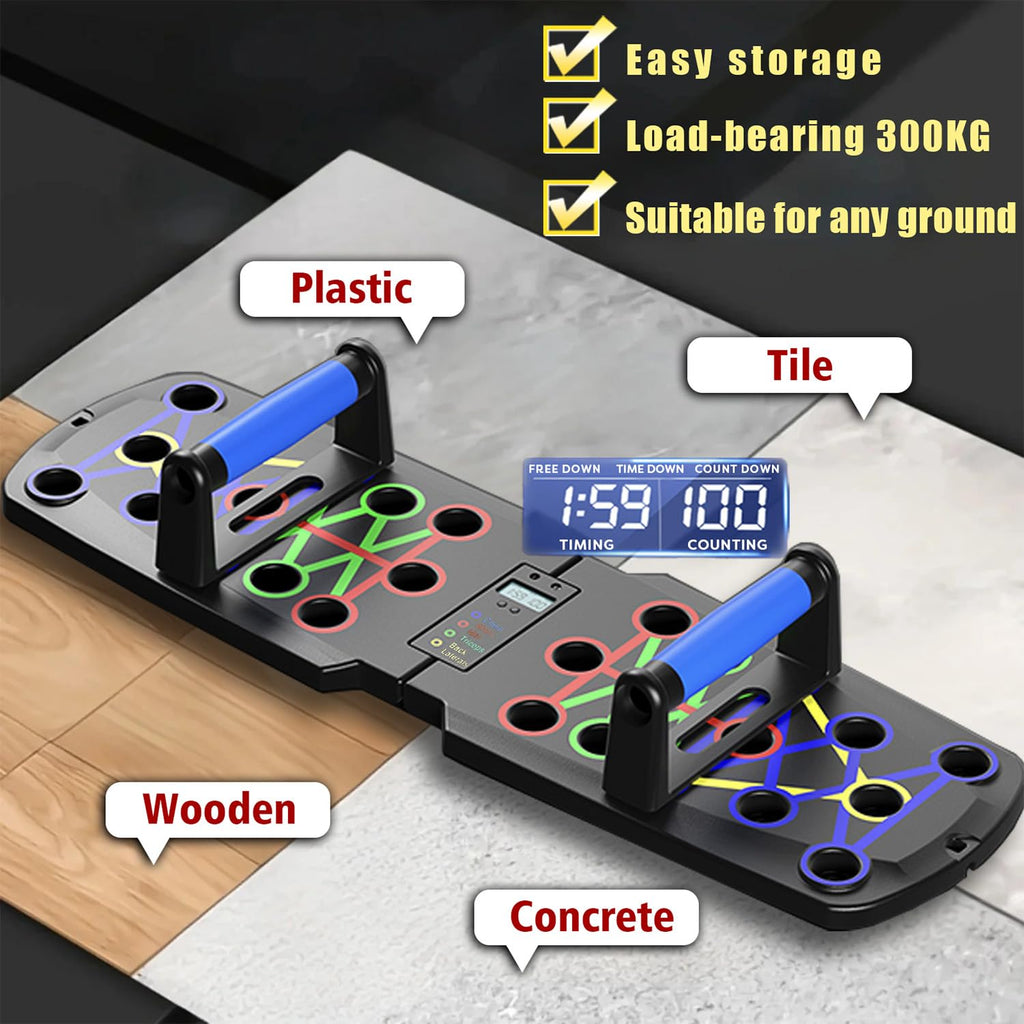 Elevate your at-home fitness routine with this smart push-up board featuring built-in digital counting and timing functions. Designed for men and fitness enthusiasts who want precision, efficiency, and variety in their workouts, this multi-functional push-up station combines strength training with intelligent technology. The integrated LCD screen offers three modesfree count, countdown, and timed trainingso you can track reps and duration without distractions. With a sturdy ABS construction and reinforced design, it supports up to 300kg, making it ideal for intense daily use. The ergonomic blue silicone handles provide a comfortable, non-slip grip, reducing hand fatigue during long sessions. The boards surface features color-coded zonesblue for chest, red for shoulders, yellow for back, and green for tricepsallowing you to target specific muscle groups with over 30 customizable push-up variations. Non-slip rubber pads on the bottom ensure stability on any floor surface, from wood to concrete. When not in use, the compact folding design saves space and makes storage effortless. Perfect for home gyms, offices, or travel, this all-in-one fitness tool helps you build strength, improve posture, and achieve your fitness goals efficiently.