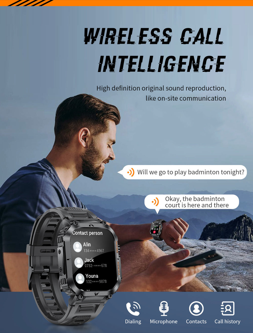 - Intelligent Voice Calling: Make and receive calls wirelessly via Bluetooth, access contacts, and view call history directly on the watch.