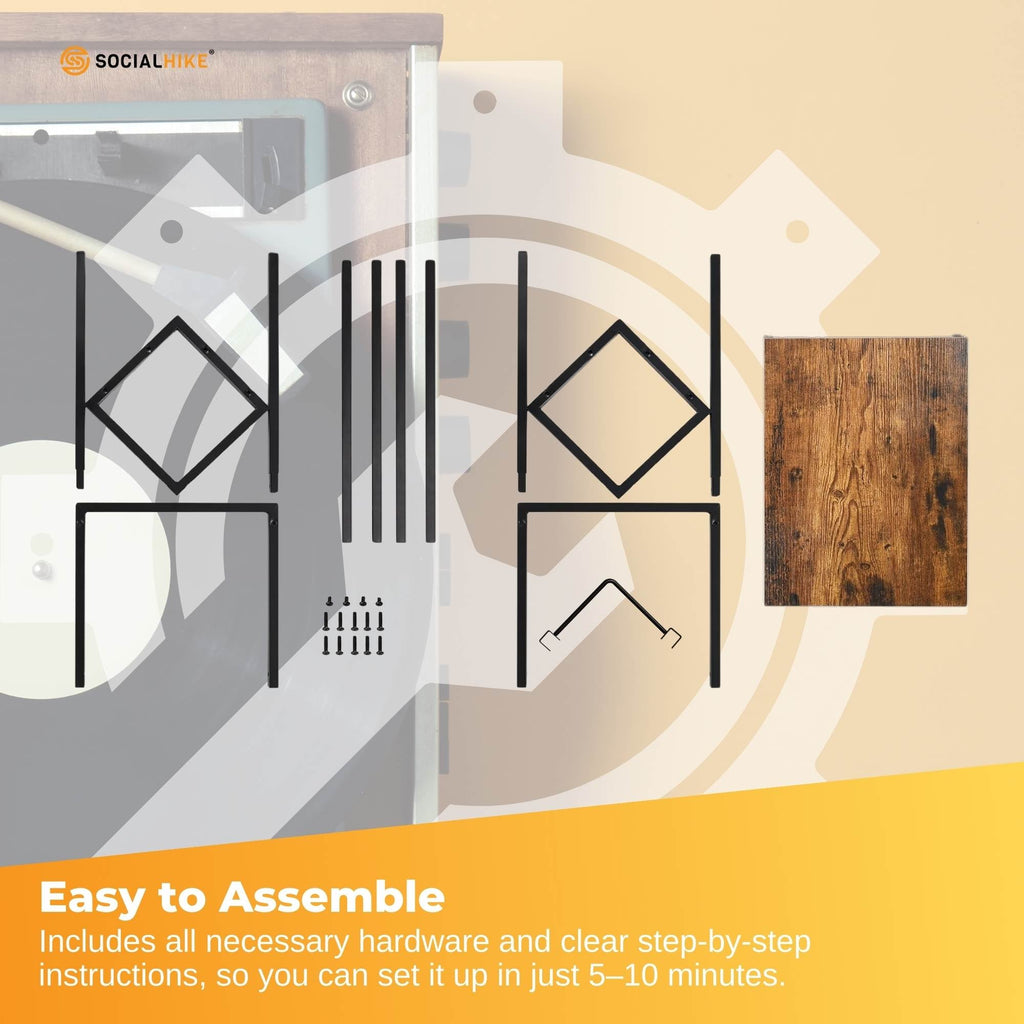 Upgrade your music space with this Social Hike Turntable Player Stand Vinyl LP Record Album Storage - Black Metal. A stylish and functional record player stand, designed to keep your vinyl collection organised. Featuring a spacious two-tier design, this stand holds up to 80–100 records, with a V-shaped metal storage rack for easy access to your favourite albums. The rustic brown wooden tabletop blends seamlessly with a modern matte black metal frame, adding a touch of vintage charm to any room.