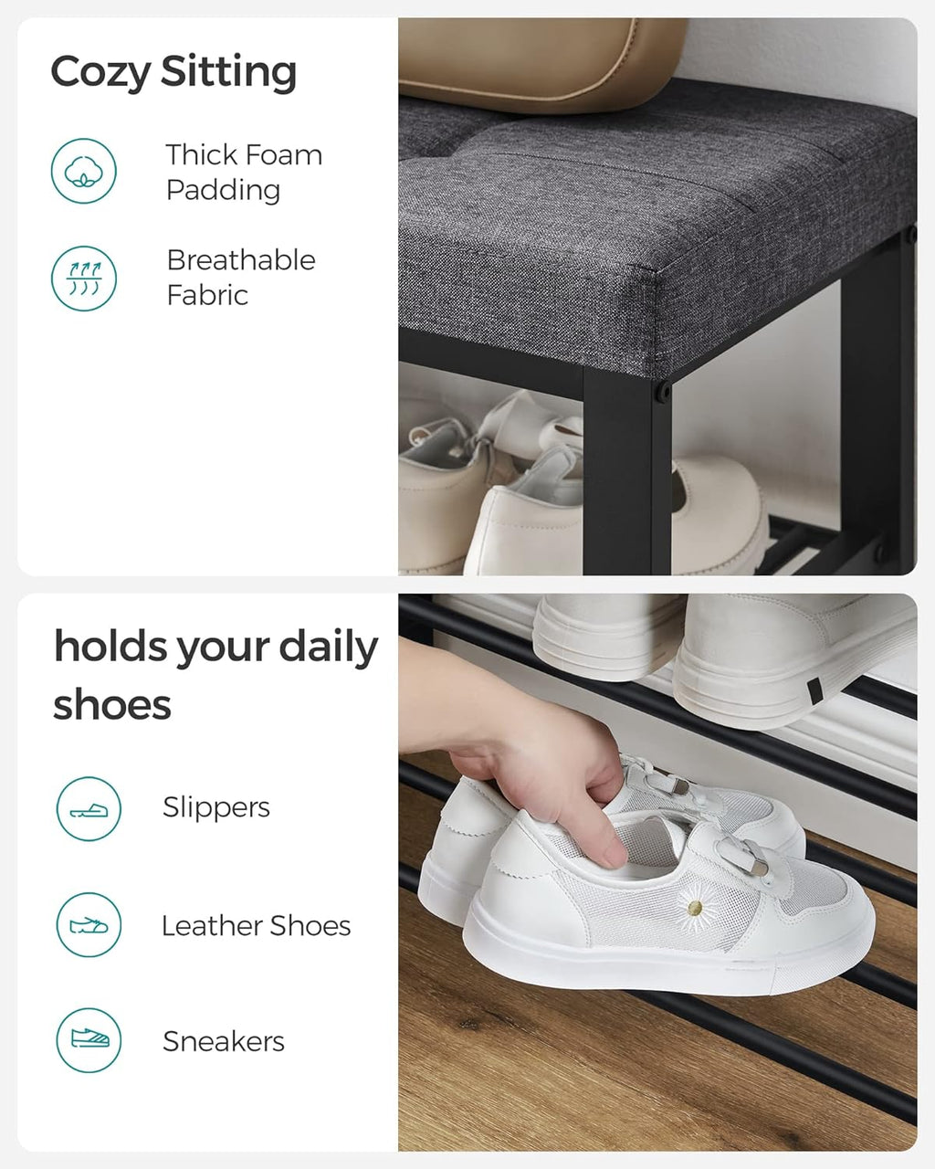 This shoe rack bench supported with a robust powder-coated steel frame offers firm and reliable support (max. static load 440 lb) -