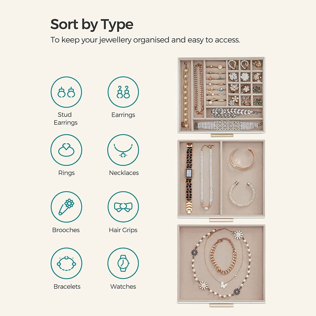 - 3 LAYERS, 7 ROWS, 19 COMPARTMENTS: Rings go in slots, earrings in small cubes, necklaces in the narrow ones, what else? With various layouts and compartments, this jewelry organizer will bring all your treasures under control, from bracelets to studs