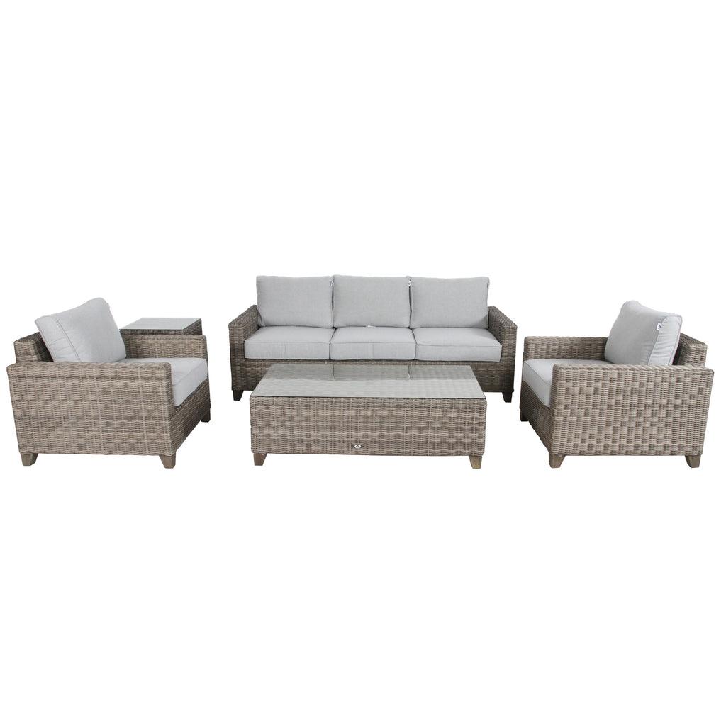 This great-looking set of 3+1+1 seater sofas with a coffee table and a side table makes any outdoor space look cool. Beautifully designed in traditional style with a touch of modernity, all the furniture pieces showcase high-strength half-round wicker supported by a strong aluminium frame. Featuring deep and wide seat cushions, the sofas have been crafted to offer the perfect lounging experience. Their cushions are made of all-season material, so they are weatherproof, water-repellent, and also UV protected. The good-looking coffee table and side table feature a clear glass tabletop, piped cushions, and painted aluminium feet. The furniture pieces can easily withstand a sunny and hot season as well as a rainy one. The structural frame of the set is made of aluminium and big, half-round wicker. The metal and wicker frame provides it with great durability, and the frame is made of non-rusting, lightweight aluminium. The sofas are upholstered in polyester. The wicker is brown, while the fabric is a light grey. It comes with a one-year warranty.
