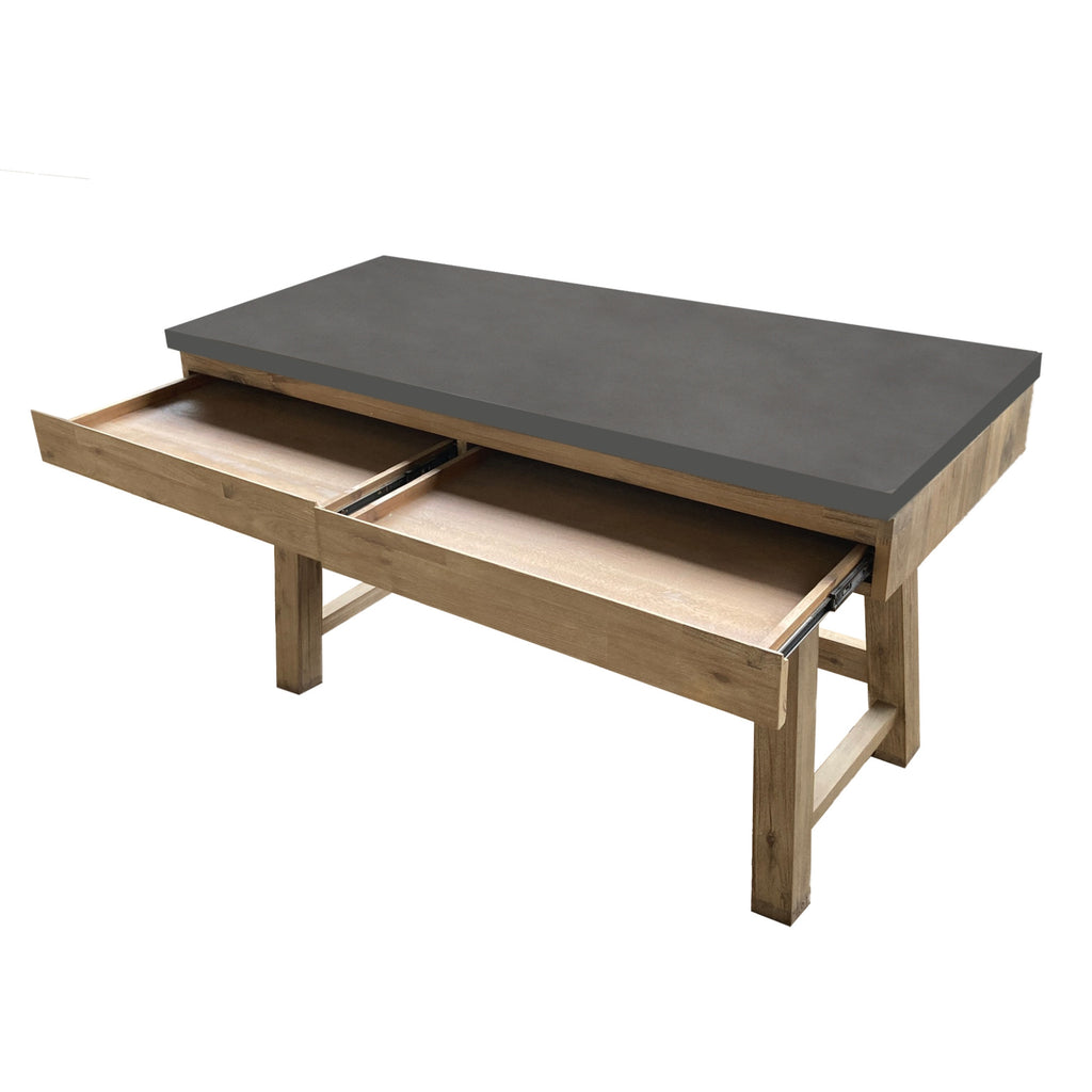 This stylish desk with 2 drawers will become the key attraction in your living area. The desk, designed in a contemporary style, showcases a 2-tone feature. It has pewter legs with a grey concrete top. A perfectly symmetrical shape gives it a nice look. The desk frame is made of sustainably harvested and sandblasted solid acacia timber. The elegant furniture has a one-of-a-kind design with a top and legs in different colours and materials. A one-year warranty is included with the easy-to-assemble desk.