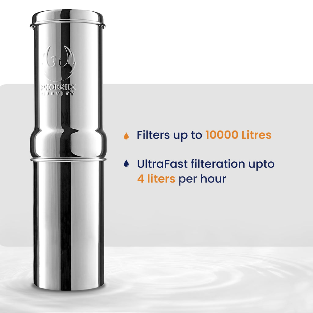 • Unlike plastic filters, Phoenix Gravitys 304-grade stainless steel housing wont leach toxins, polyurethane, microplastics or harmful chemicals into your water.