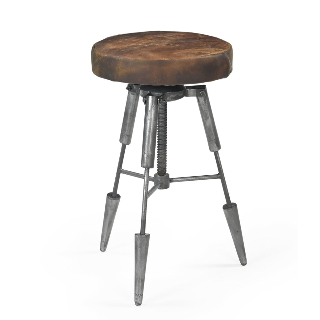 A bold looking piece, our Tripod Leather Stool is one of the newest additions to our industrial stool collection. Upholstered with a soft vintage chocolate coloured leather seat, the stools base features a striking tripod design with arrow-like tapered cast iron legs. This is a strong piece well suited to Manhattan loft style spaces or industrial interiors. The stool is wind up.