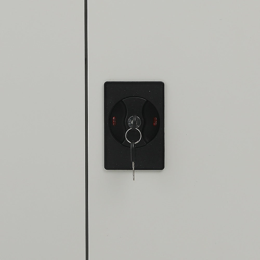 It has four internal metal shelves that define 5 storage spaces, a bottom with lateral and central reinforcement, metal hinges, and galvanised pins in inconspicuous places, and a safety lock with 2 anti-keys. The 4 inner shelves they are placed on clips so they can be easily replaced. It features 2 opening doors that provide full visibility and access to the interior of the cabinet.