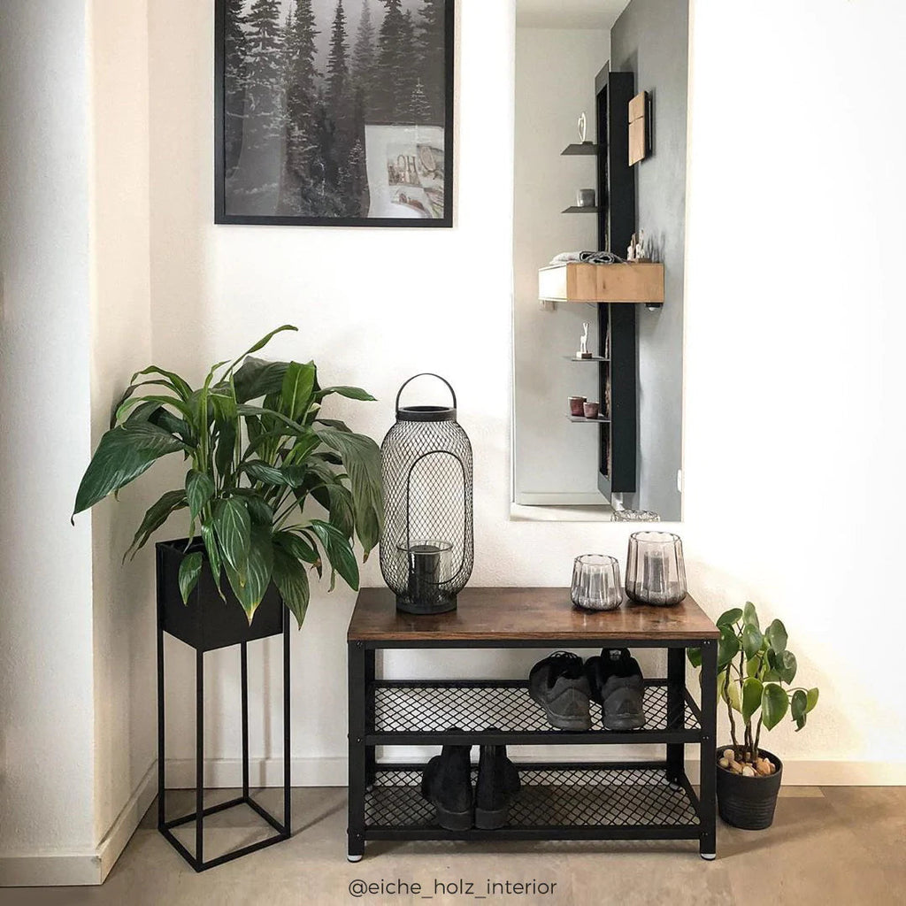 Welcome Home: Don't let an empty, dull entrance wait for you as soon as you cross the threshold. Add this shoe bench with warm rustic brown panels and a black steel structure, hang a coat rack over it, and your entrance will have another flavour