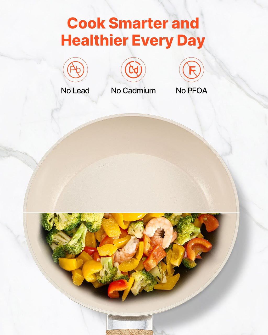 The aluminum skillet set features an ergonomic bakelite handle with heat guard, making it stay cool on the stovetop. Its water-transfer wood grain finish provides a stylish, real-wood look with a secure and comfortable grip