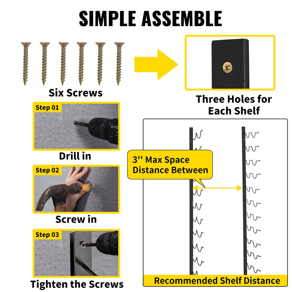This wine rack kit includes 6 screws for easy, hassle-free installation. There are three holes separately in the two shelves. Just drill holes, tight screws in the wall, then fix the wine rack with screws and make sure they are in the same direction. The installation is down. A few minutes is all you need.
