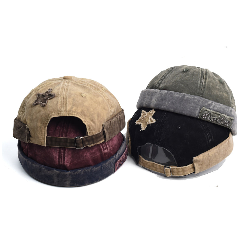 Vintage Washed Cotton Docker Cap - Unisex Brimless Beanie Hat with Star Patch & Adjustable Strap