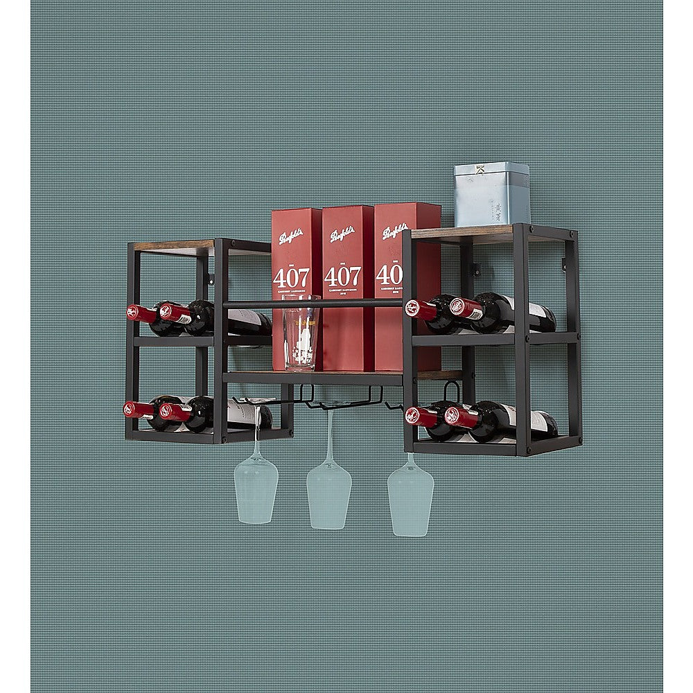 Designed with a vintage industrial flair, this wall-mounted wine rack combines a sturdy matte black iron frame with a rustic brown partial wood shelf. Its charming farmhouse accent adds a touch of elegance to your home, kitchen, dining room, or countertop. It's not only a practical rack but also makes a thoughtful gift for wine lovers.
