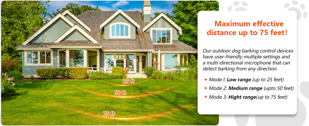- Adjustable Range & Sensitivity: Offers three distinct operational range settings - up to 25ft (7.6m), 50ft (15.2m), and an impressive 75ft (22.8m). Easily adjust the sensitivity to suit the barking distance and your specific environment.