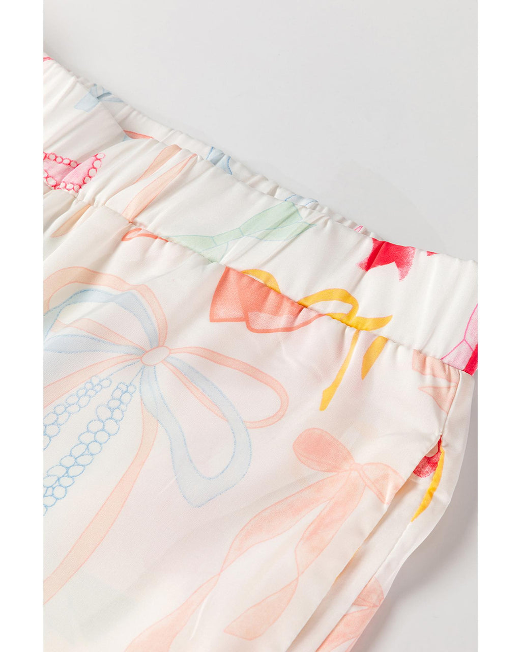 White Bow Knot Print Lapel Collar Wide Leg Satin Pajama Set - L