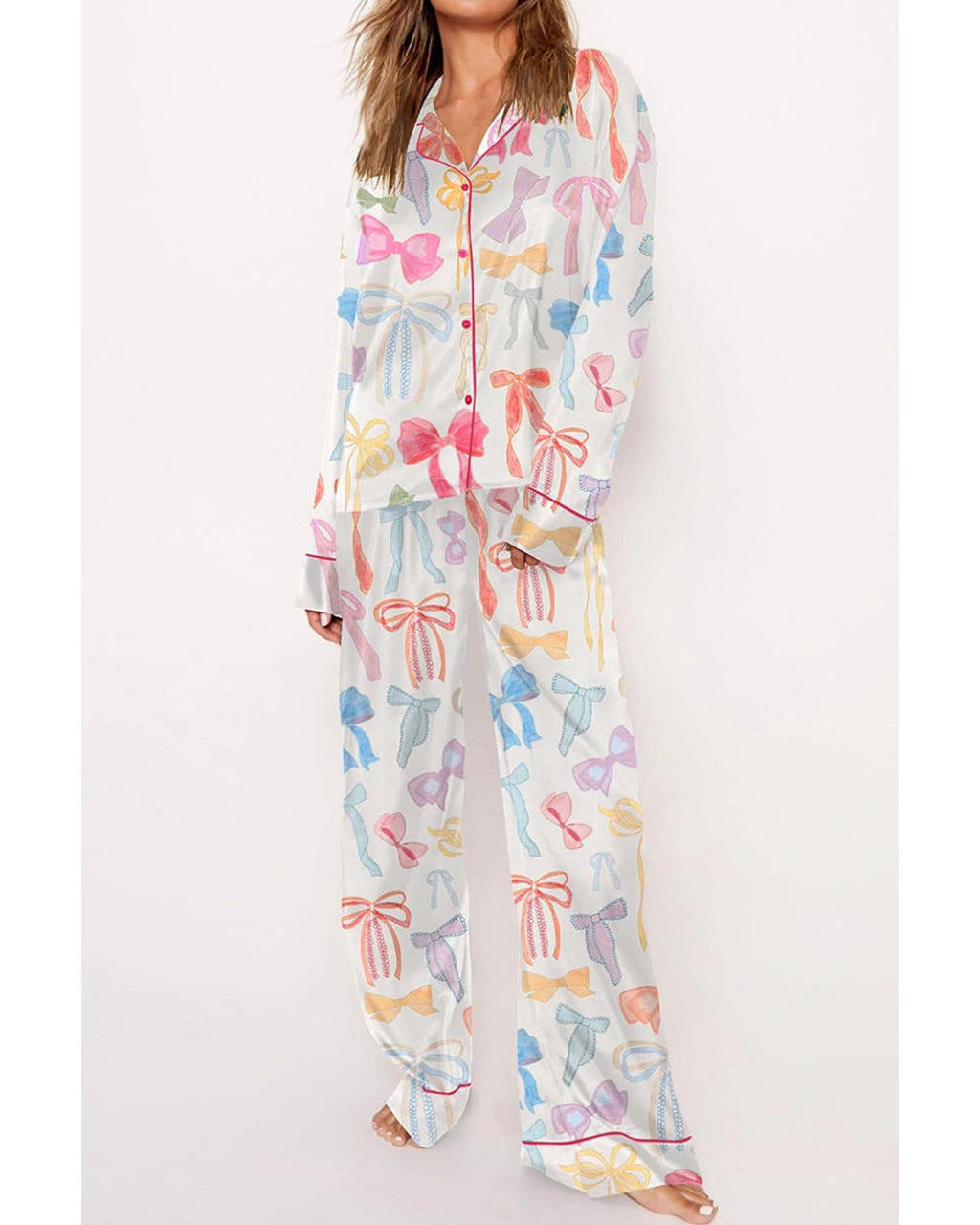 White Bow Knot Print Lapel Collar Wide Leg Satin Pajama Set - S