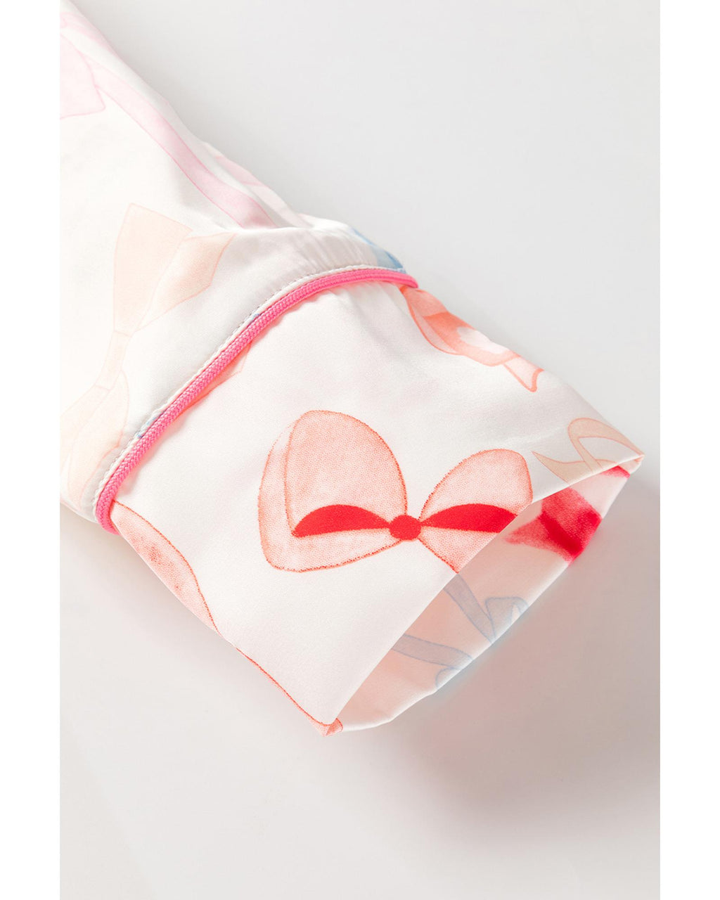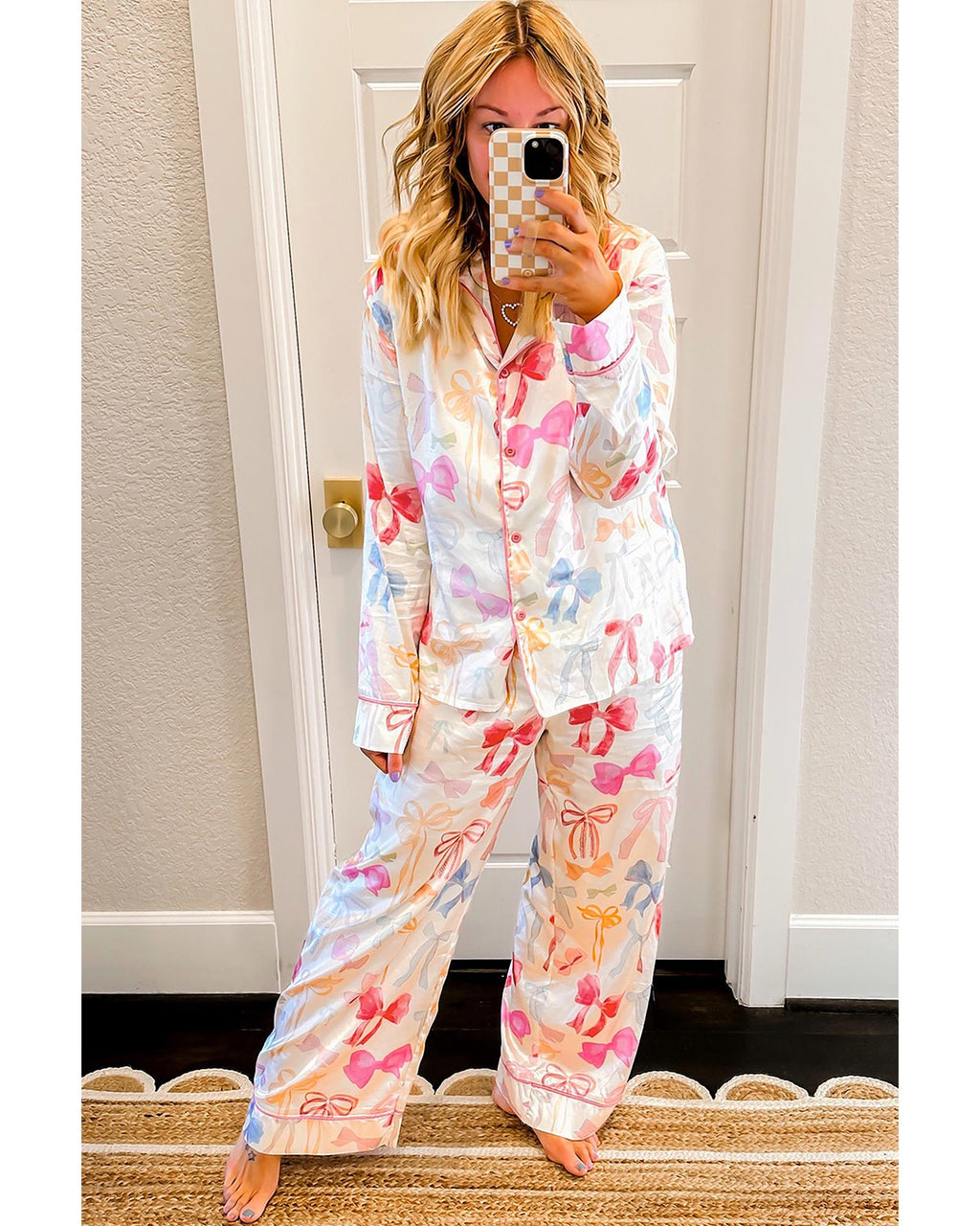 White Bow Knot Print Lapel Collar Wide Leg Satin Pajama Set - XL