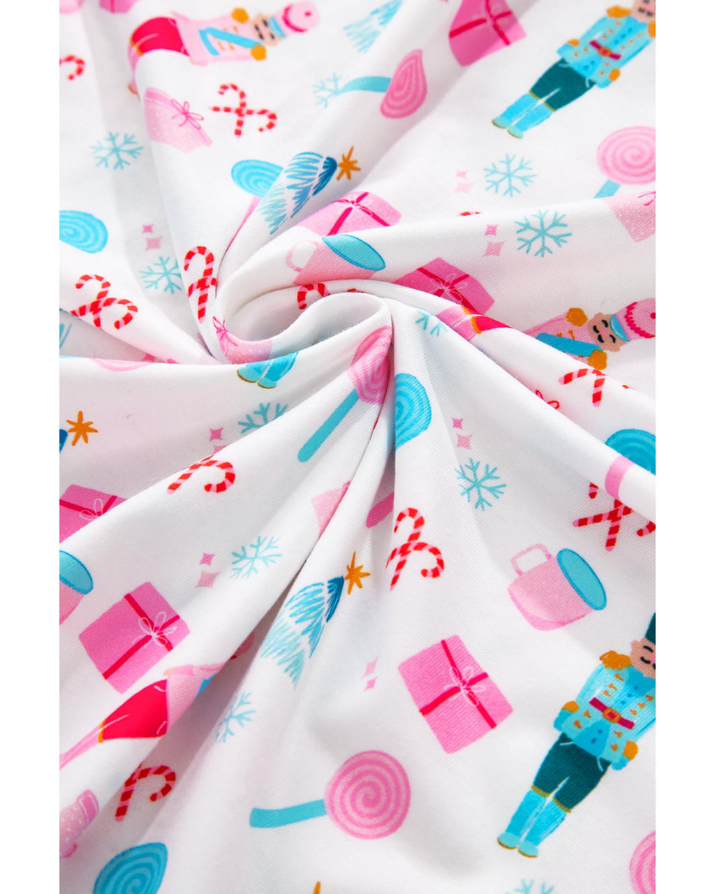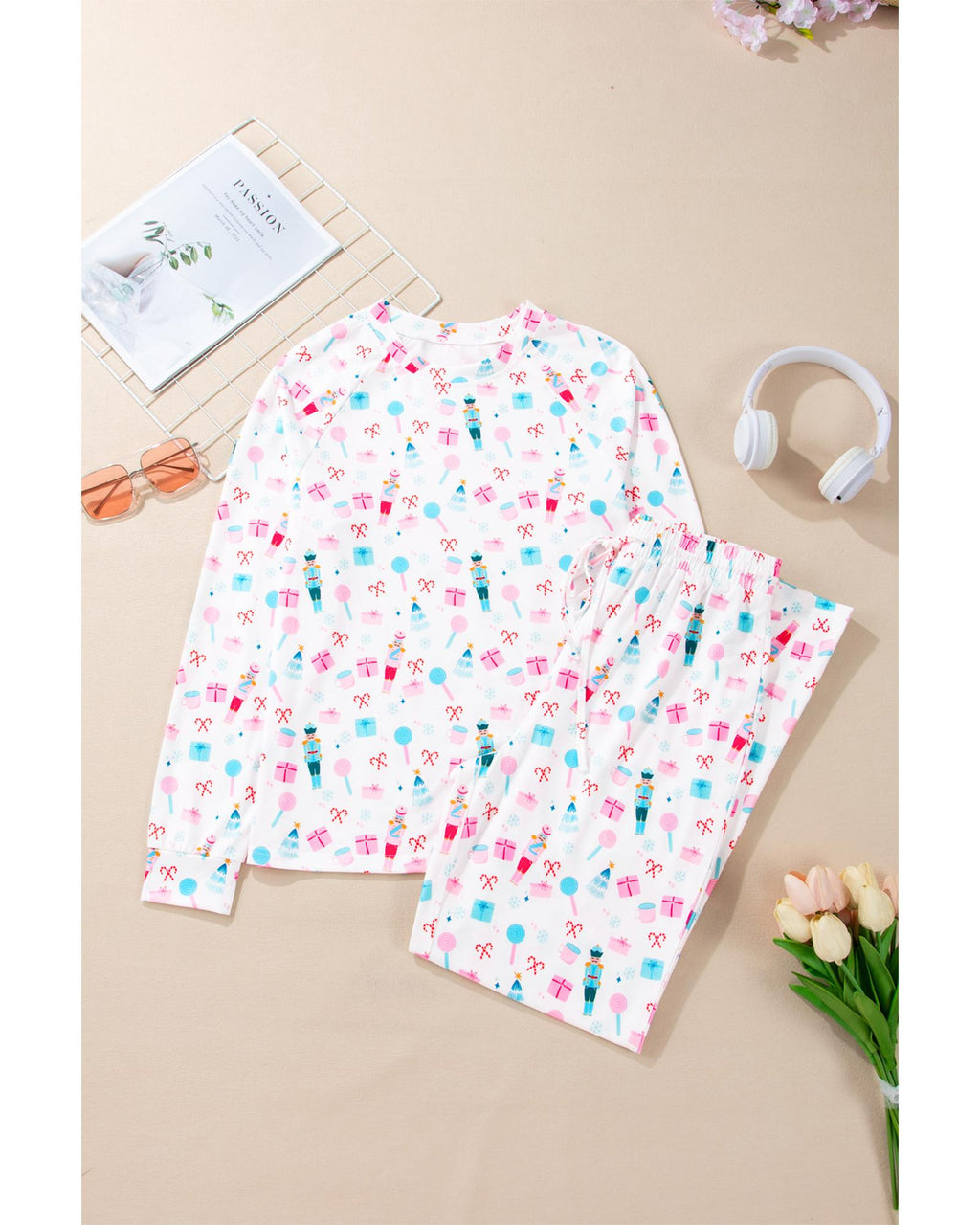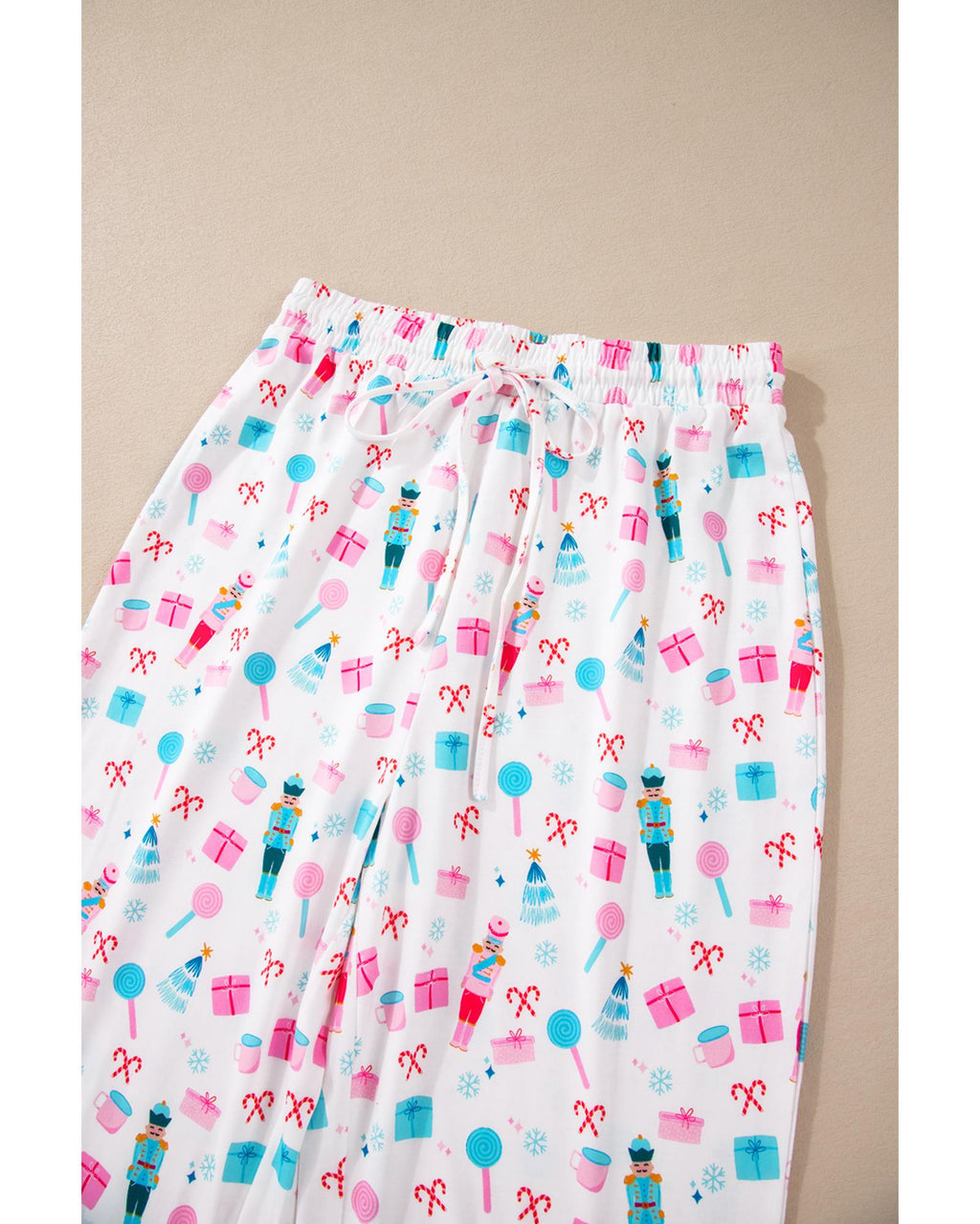 White Christmas Pattern Long Sleeve Top and Wide Leg Pants Set - S
