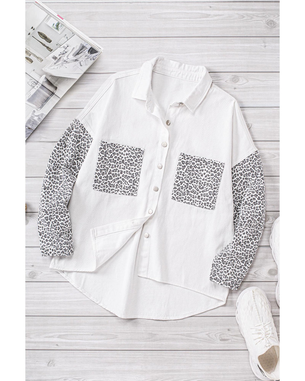 • Light wash denim body with contrast leopard print sleeves